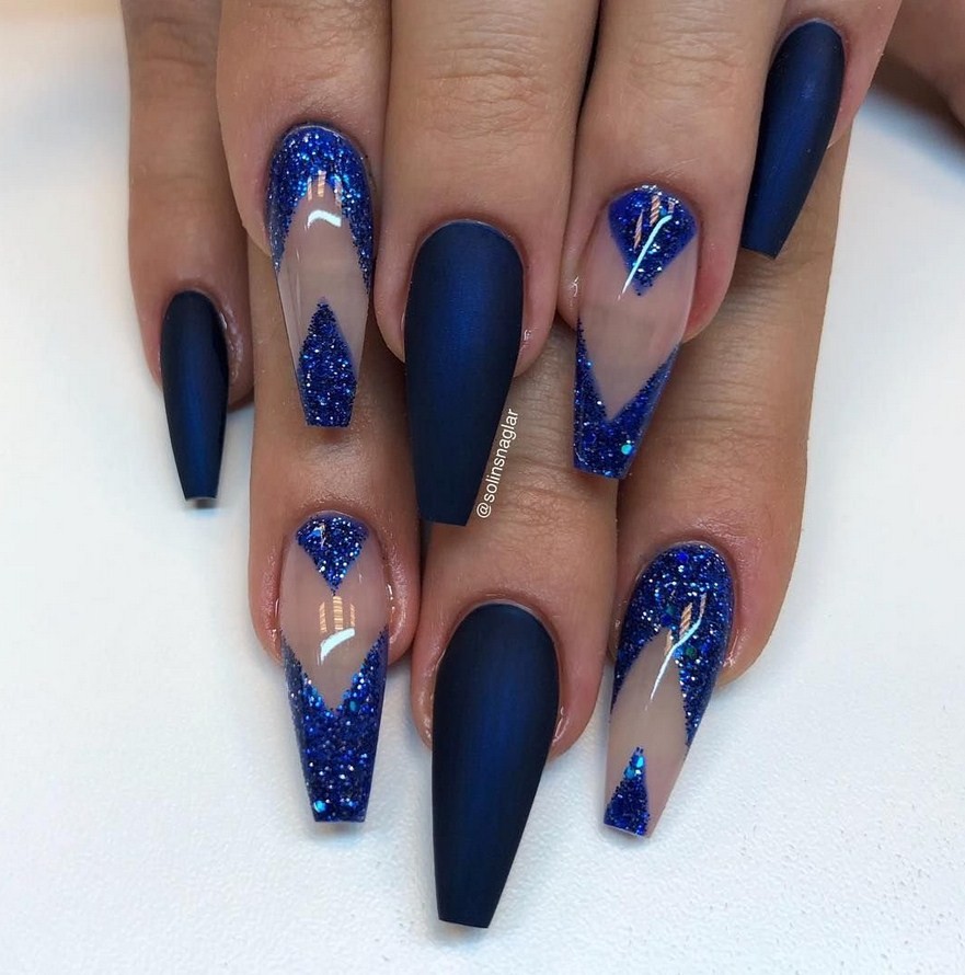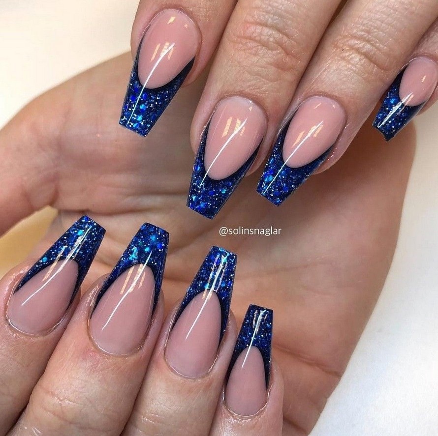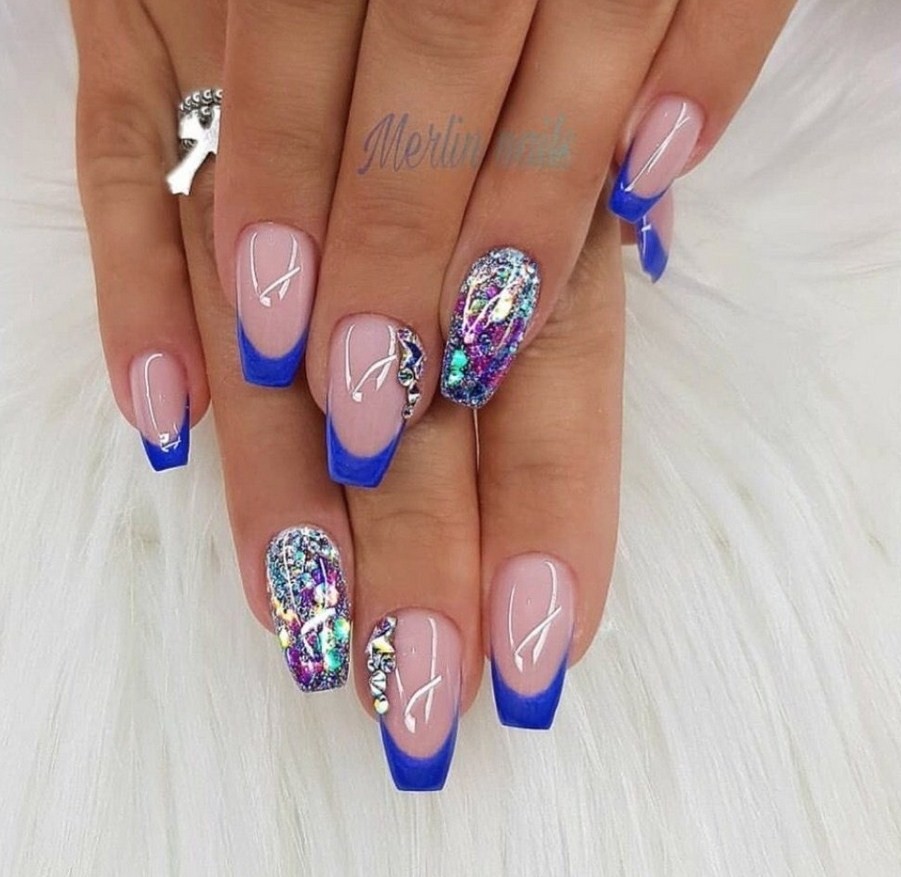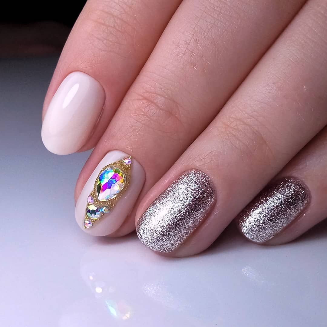 Если вы любите сияние, можете смело использовать глиттер, фольгу или стразы на всем ноготке или только свободном кончике, ведь на такой длине уместен любой дизайн.