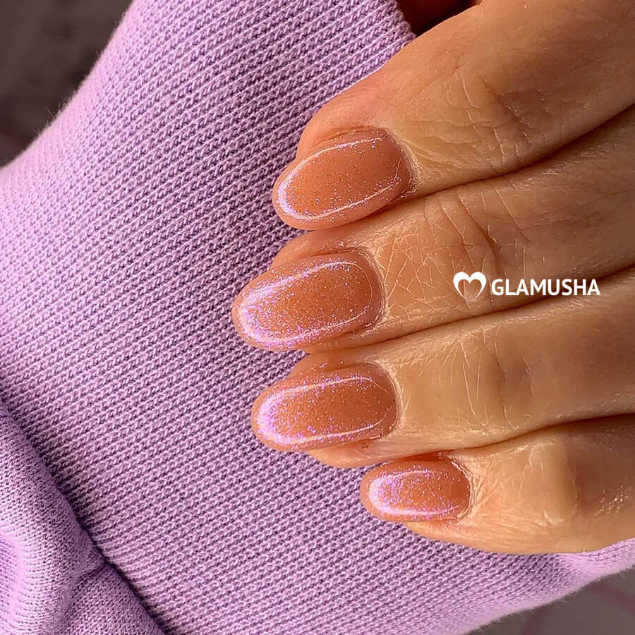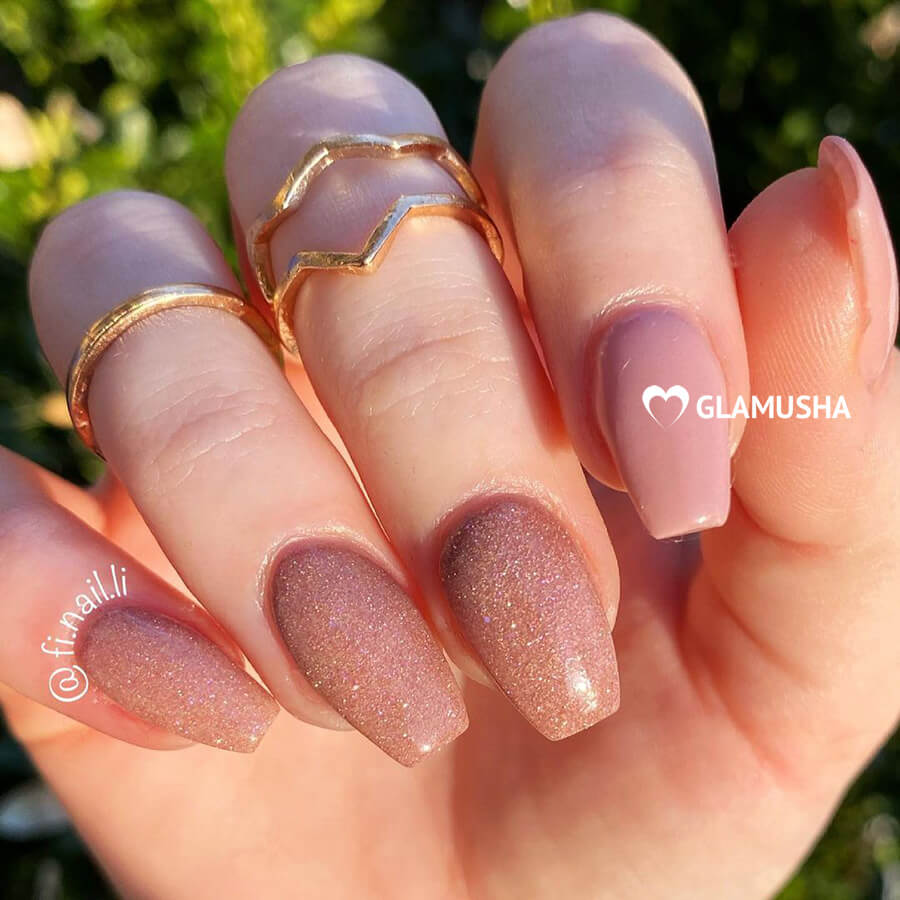 Важен цвет блесток. Они должны сочетаться с основным цветом. Слишком яркие оттенки не используют. Нюд дополняют схожими по оттенку блестками.