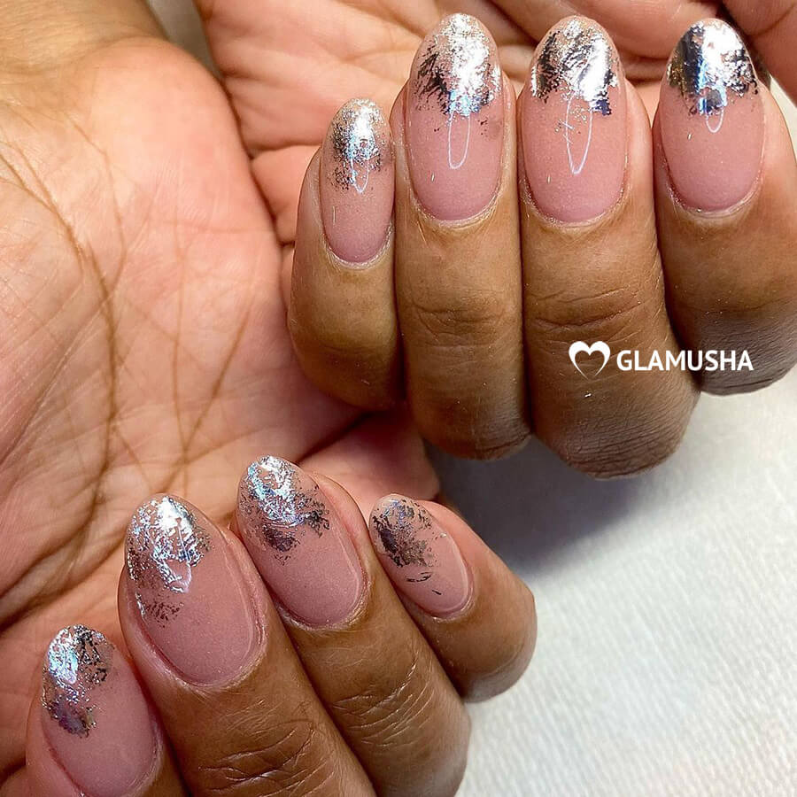 Фольгированные элементы в маникюре и жидкие гели с эффектом фольги — тренд уходящего и 2023 года. Бонус: отличная альтернатива блесткам и стразам, смотрится блестяще и модно.