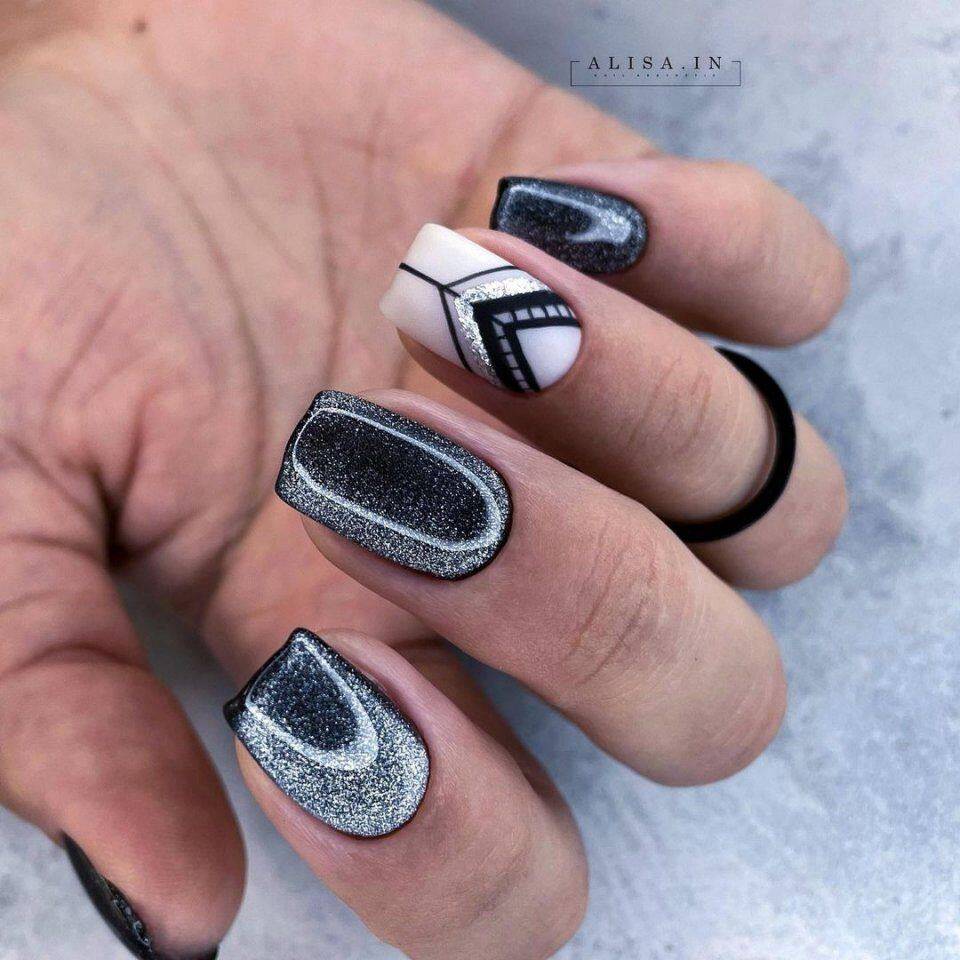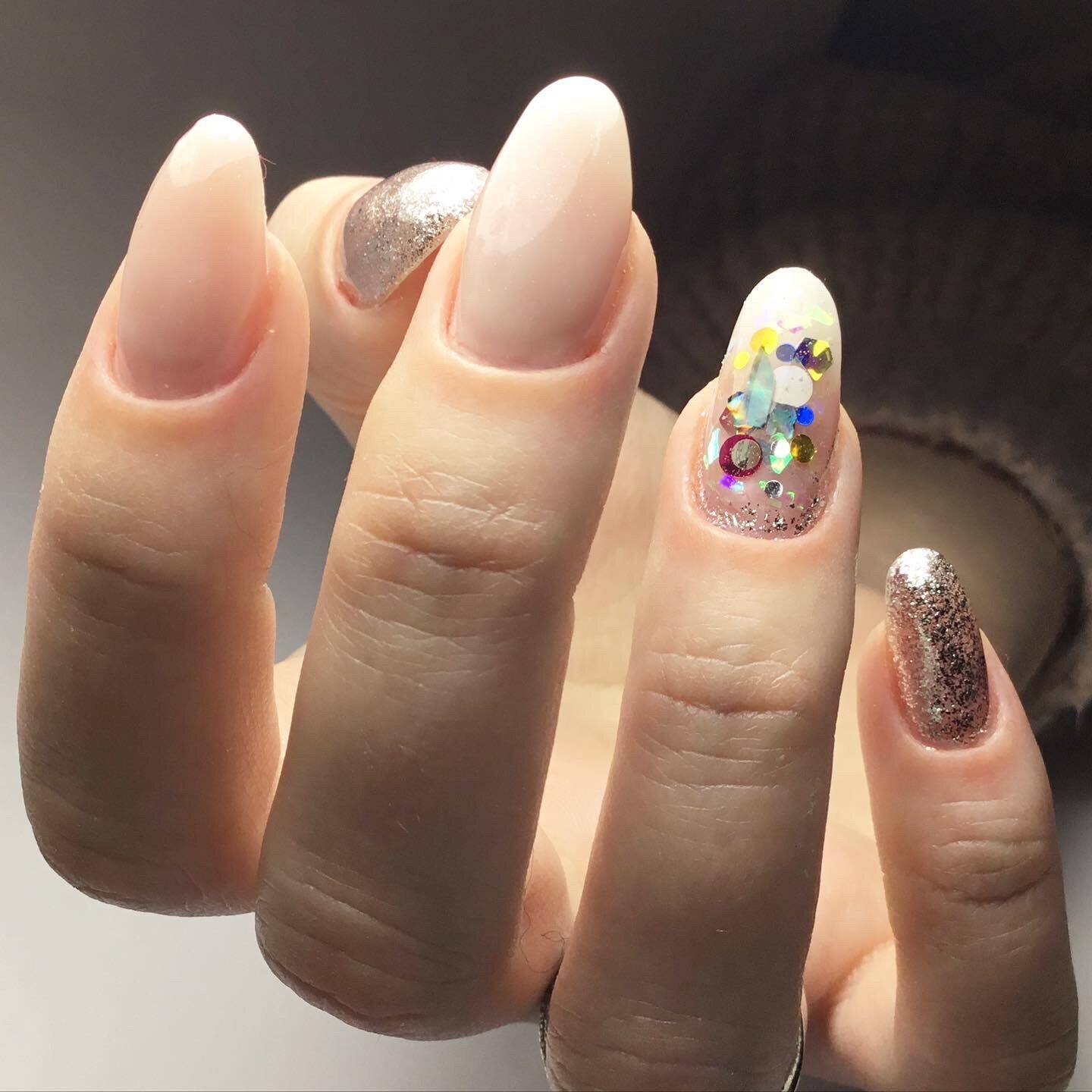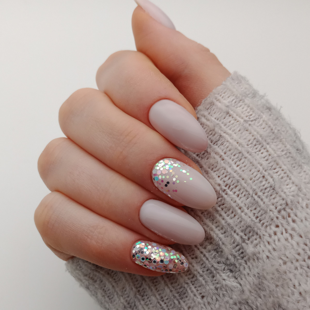 Используйте блестки – они отлично подходят для украшения ногтей средней длины и коротких. Они помогут придать нужный объем, подчеркнуть идею образа.