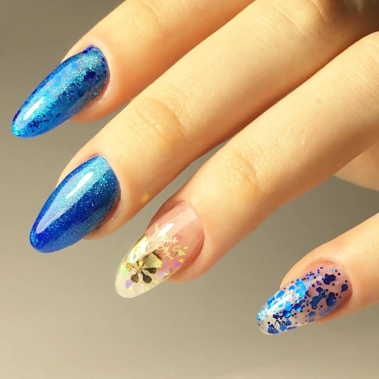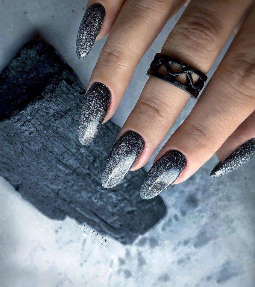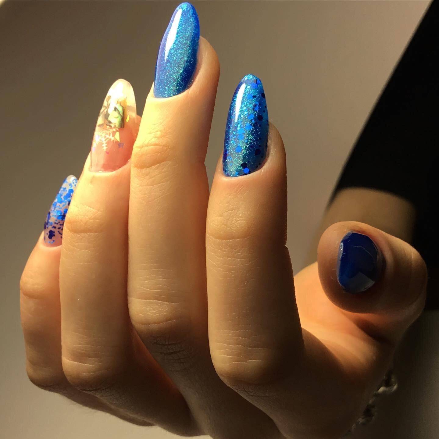 Используйте блестки – они отлично подходят для украшения ногтей средней длины и коротких. Они помогут придать нужный объем, подчеркнуть идею образа.