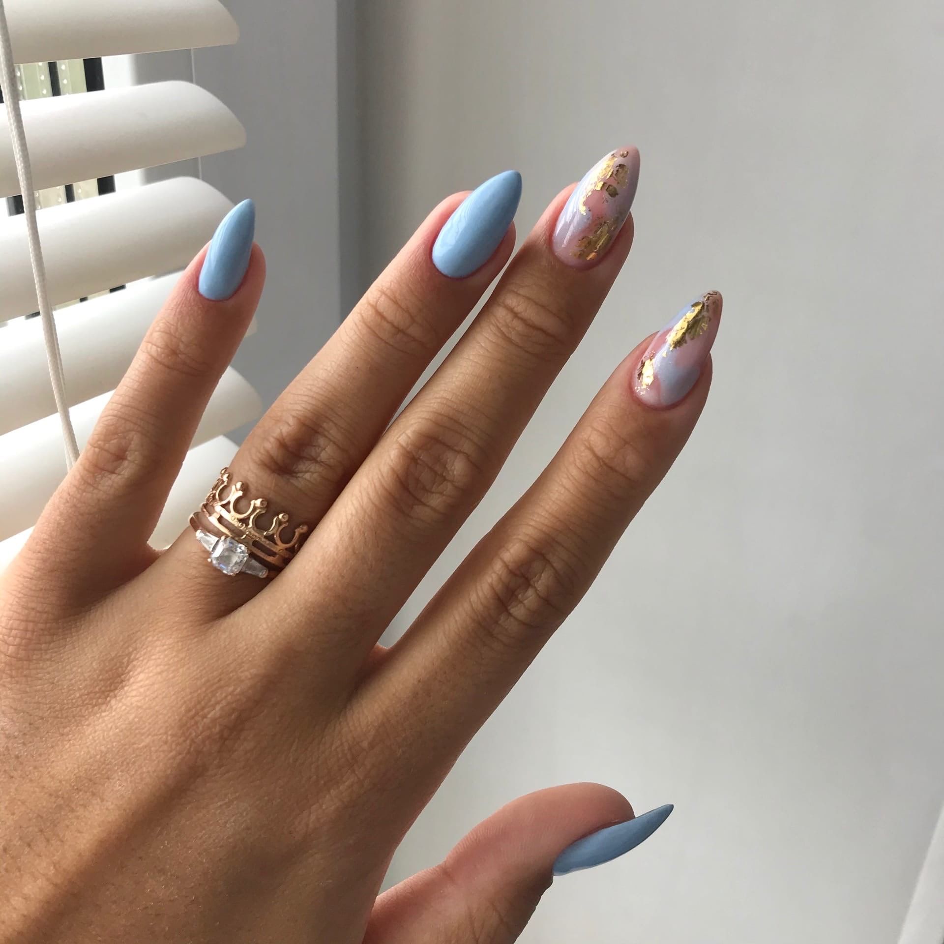 Прорисуйте синими блестками лунку, когда выполняете лунный маникюр нежно-голубым лаком. Образ сразу обретет праздничность и легкую торжественность, вполне уместную не только во время застолий, но и в периоды будней. Так можно скрасить себе монотонность рабочей недели, добавив нотку свежести и радости.