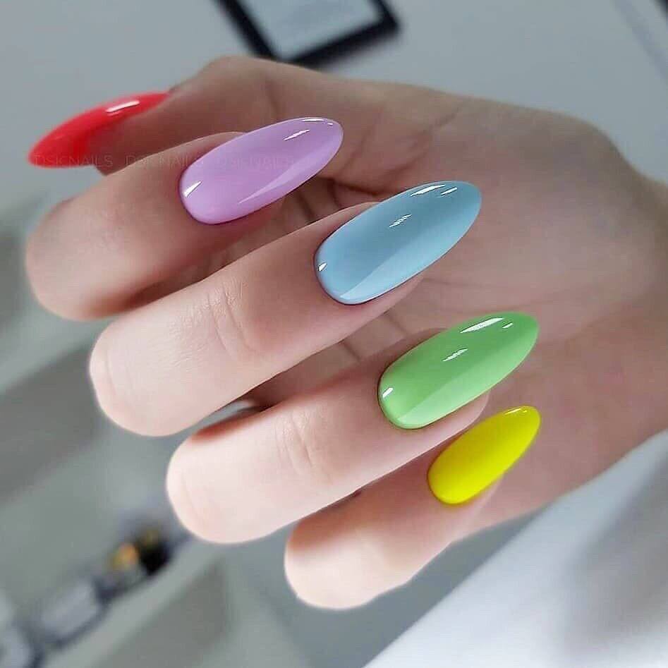 - Ногти с разным цветом. Этот вид ногтевого дизайна тоже в тренде и передаёт эстафету 2022 году. Здесь ногти одной руки имеют одно цветовое покрытие, а другой руки – другое. Важна сочетаемость цветовой гаммы.
