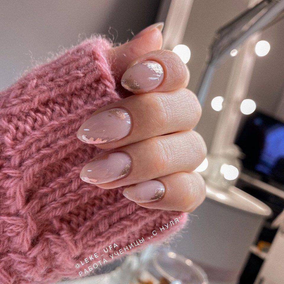 Дизайн с фольгой идеально подойдет для потрясающих вариантов зимнего маникюра. В сезоне 2020-2021 отдавайте предпочтение не только топовым вариантам фольги — золотой и серебристой, выбирайте также разноцветную, она шикарно смотрится с пастельными цветами лаков.