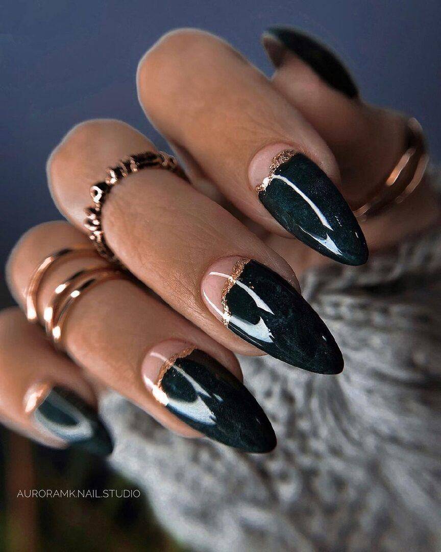 Не только спокойные нюдовые и пастельные оттенки присутствуют в модных тенденциях 2021 года. Более смелым и интересным решением являются темные варианты маникюра. В этом случае всё так же можно обратиться к идее с минеральными текстурами. Ногти, выполненные в такой технике, могут напоминать агат, нефрит, обсидиан и другие тёмные минералы