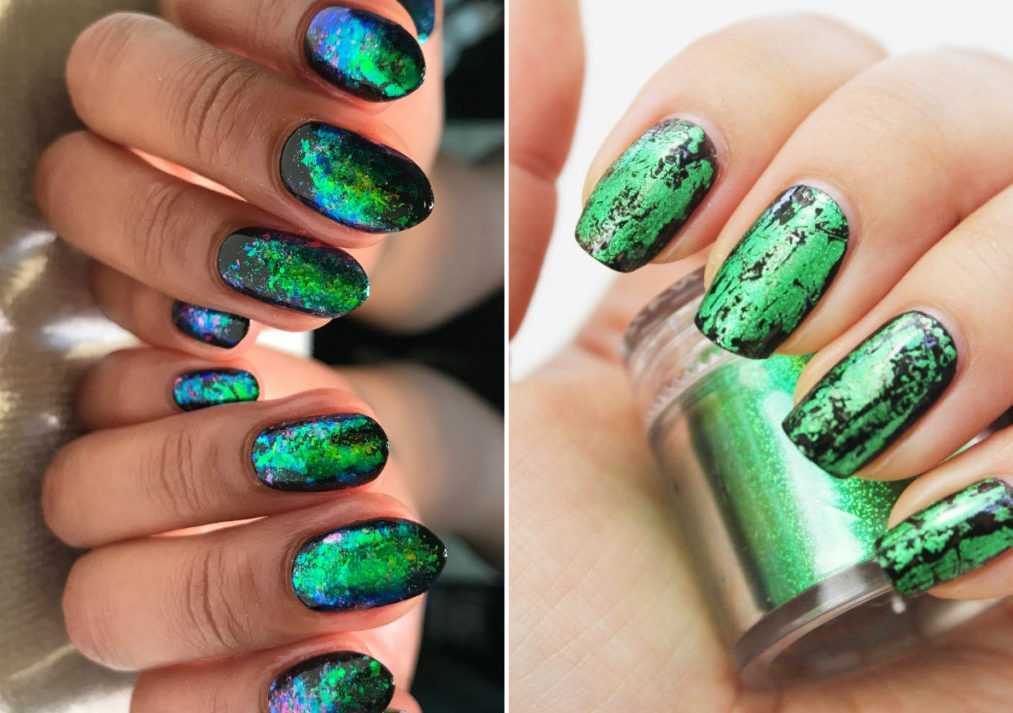 Выполните дизайн ногтей в темных оттенках, дополняя их белыми разводами с эффектом металлики — такие ногти будут смотреться дорого, очаровательно и, что не менее важно, модно. Следующий интересный эффект на ногтях можно воссоздать при помощи всего лишь одного лака с эффектом голографического сияния. Такой маникюр смотрится красиво и необычно, напоминая собой космические просторы
