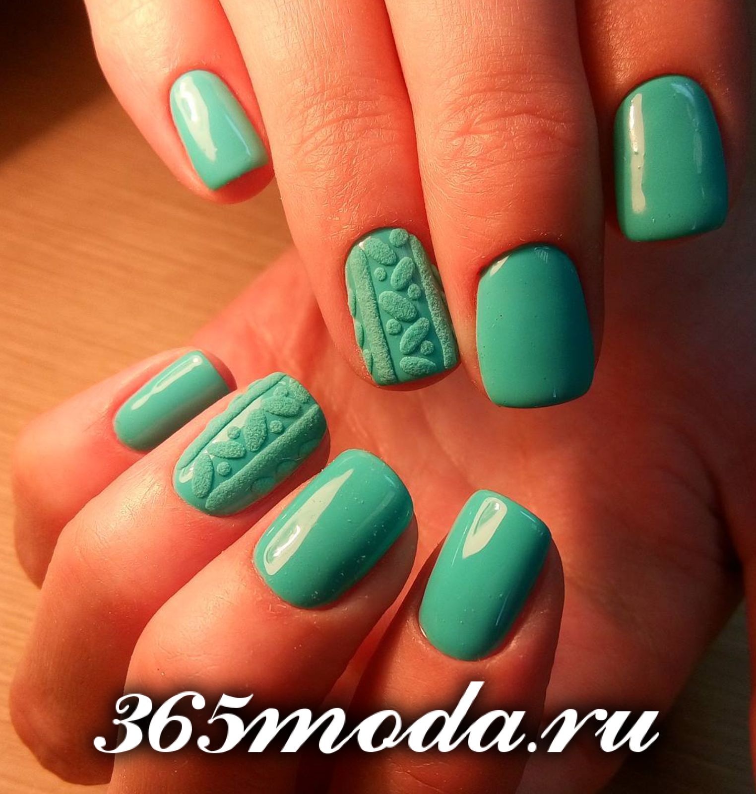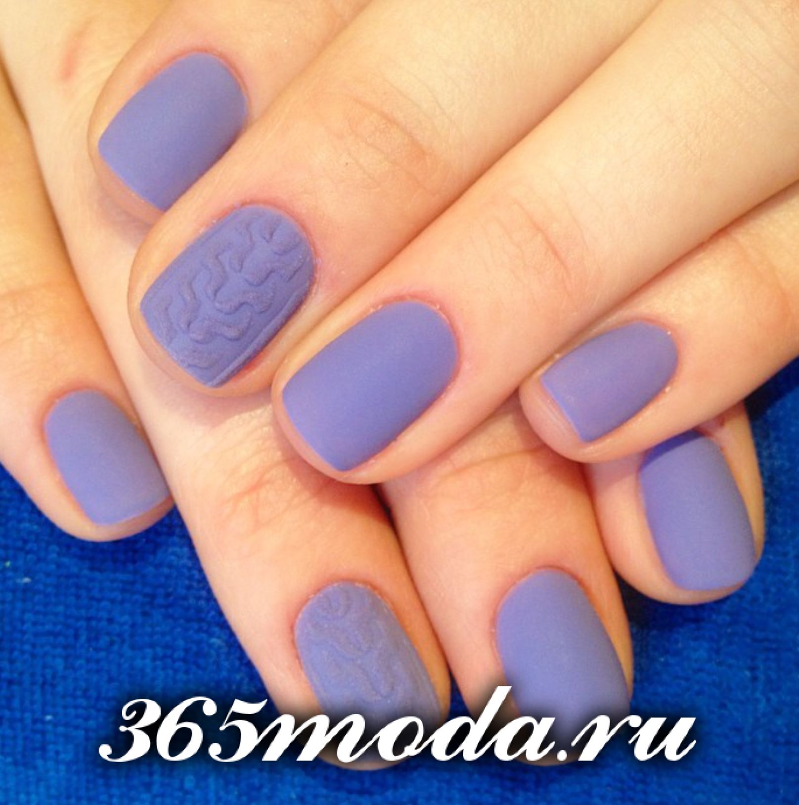 Особенно популярен, в холодное время года, «вязанный» дизайн. Такой объемный маникюр будет выглядеть не только стильно, но и создаст атмосферу домашнего комфорта и уюта. Его делают, либо с помощью геля, либо акриловой пудры, которая и создает эффект бархатной поверхности. Такие «вязаные свитерки» смотрятся очень мило и очаровательно, как на коротких, так и на длинных ноготках.