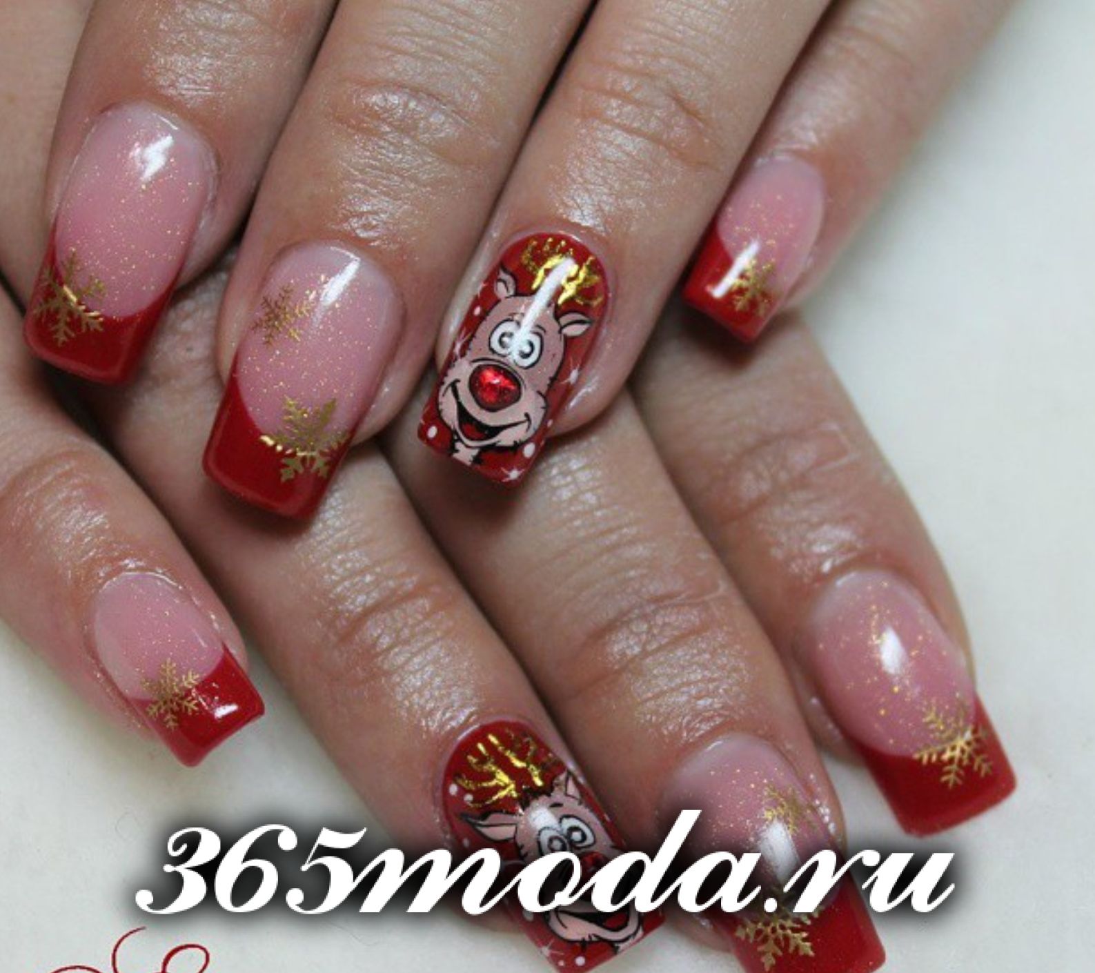 Наиболее популярными остаются тематические изображения: снежинки, елочки, подарки, гирлянды, олени, снеговики, дед морозы, елочные игрушки и многие другие. Такие рисунки выглядят очень ярко и красочно и несомненно будут поднимать вам настроение в течении всех праздников. Если же вы любите более спокойные дизайны, то вам подойдет лунный и французский маникюр, «битое стекло», «вязанный» или металлический дизайн.