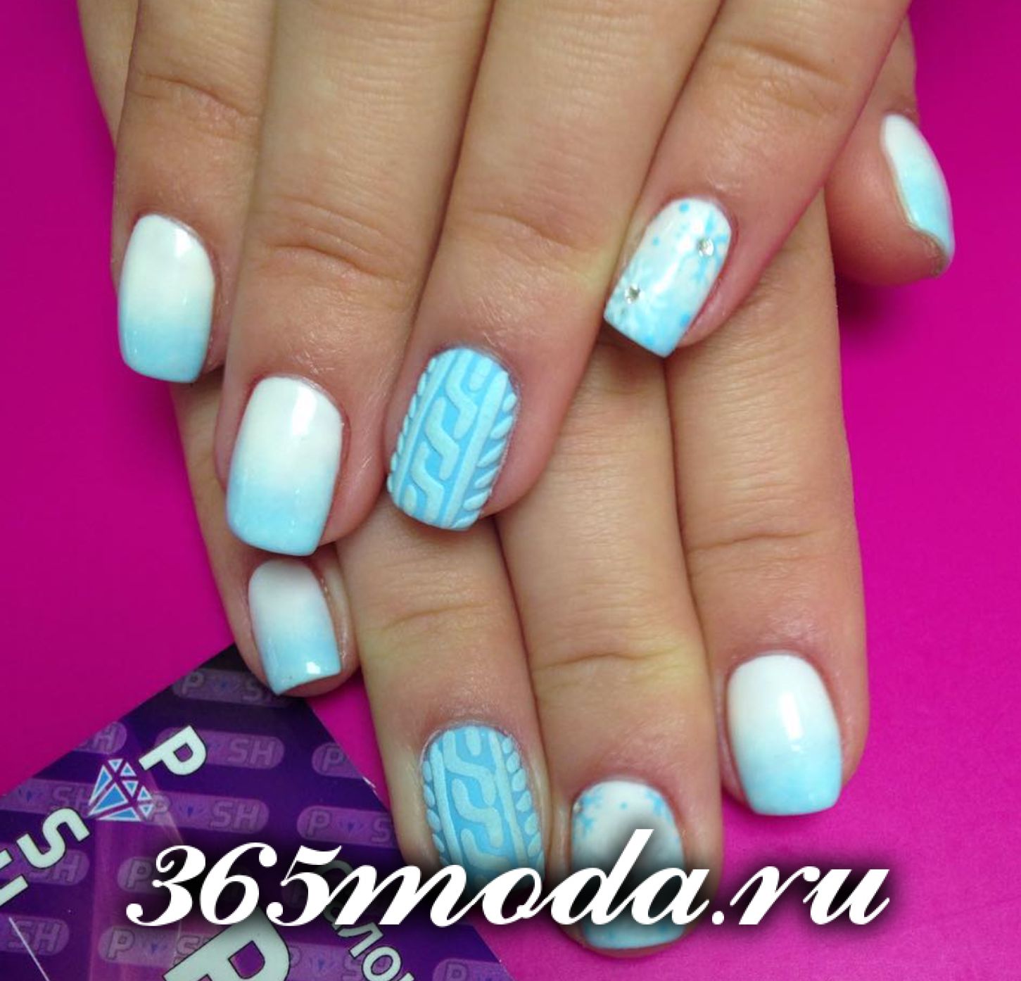 Словно «теплый» вязанный маникюр поможет согреть вас в зимние холодные деньки. Мастера столь умело передают на ноготках вязанные узоры, что кажется будто вы приклеили настоящий кусочек вязанного свитера на ваш ноготок. Узор и глубина рельефа вязанного принта может меняться в зависимости от вашего желания.
