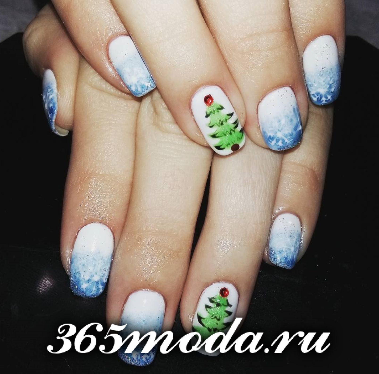 Этот дизайн выполнен в глубоких оттенках синего цвета, украшен елочкой и металлической пудрой, которая изображает эффект Рождественского снегопада. Он идеально подойдет для таинственного и праздничного образа.