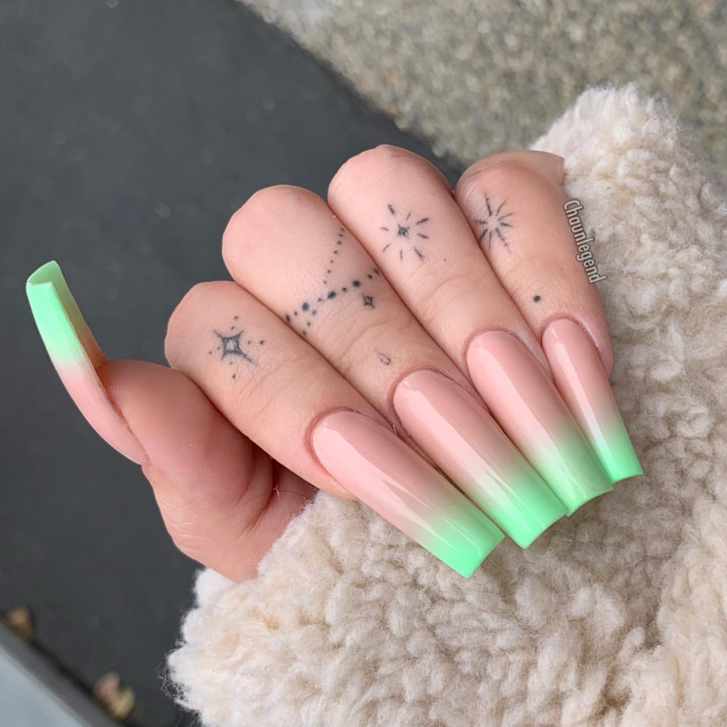 Дизайн ногтей, выполненный в технике омбре, все еще остается на лидирующих позициях. Этот нетривиальный и многогранный вариант маникюра выразительно смотрится на любой длине и с любой формой ногтей. На каждый день лучше комбинировать мятный цвет лака с базовым белым, а вот для курорта или праздничного мероприятия можно взять что-то по ярче, например, розовый, желтый или же фиолетовый оттенок. Вы можете использовать любое сочетание оттенков создавая свой индивидуальный дизайн для определенного события в своей жизни.