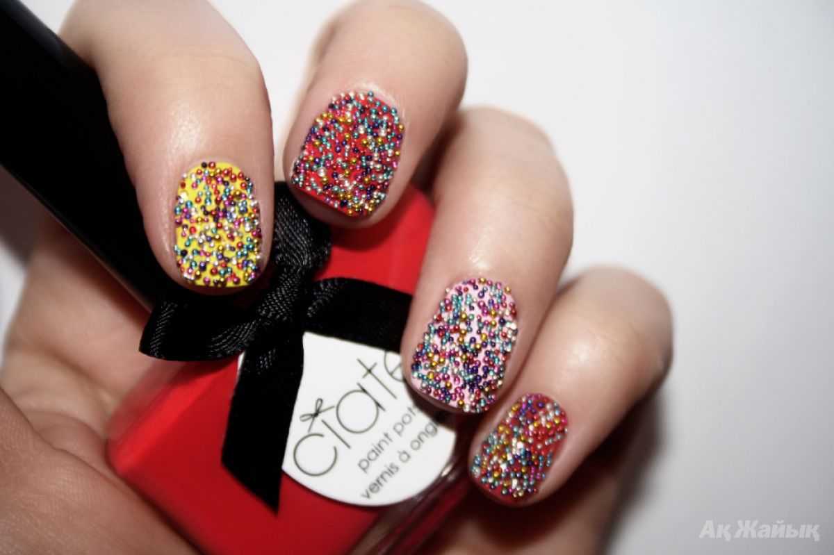 Такой дизайн никого не оставит равнодушным. Для создания икорного маникюра потребуется лак-основа или база и специальный микробисер, который в большом ассортименте представлен в маникюрных магазинчиках.