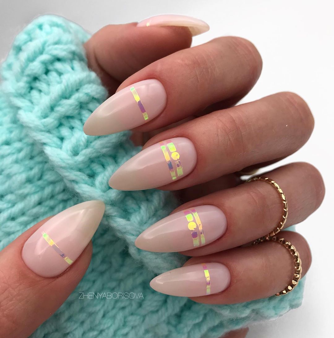 Нюдовый маникюр с блестящими золотыми полосками никогда не будет выглядеть слишком скучно, если добавить к нему золотые акценты. При этом не обязательно покрывать глиттером всю поверхность. Вполне достаточно будет нескольких хлопьев золотой фольги или небольших наклеек.
