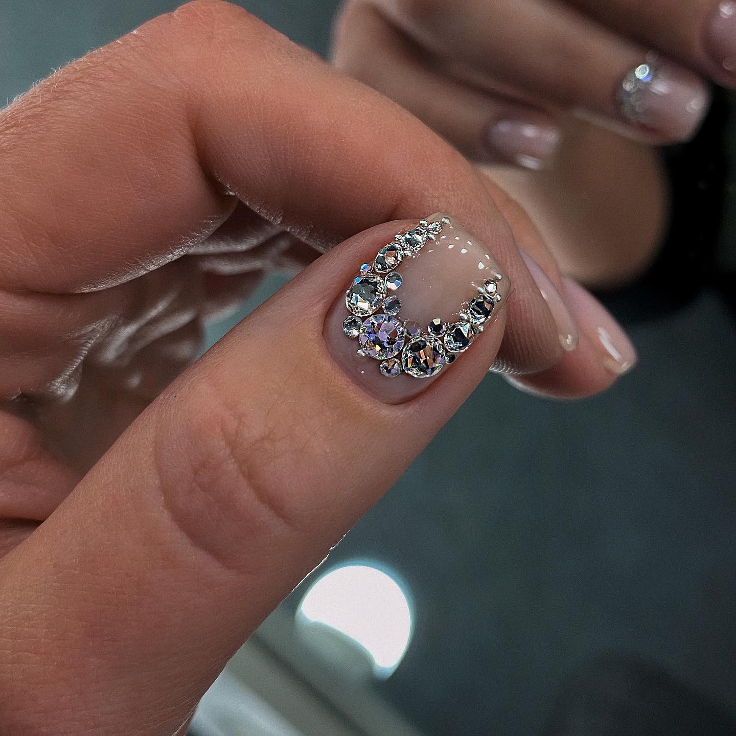 Хорошо знакомый многим декор – заслуживает отдельного восхищения. Сияющие камни на ногтях в небольшом количестве обеспечат маникюр, вдохновленный эстетикой светских вечеринок, новогодней ночи и других торжеств.