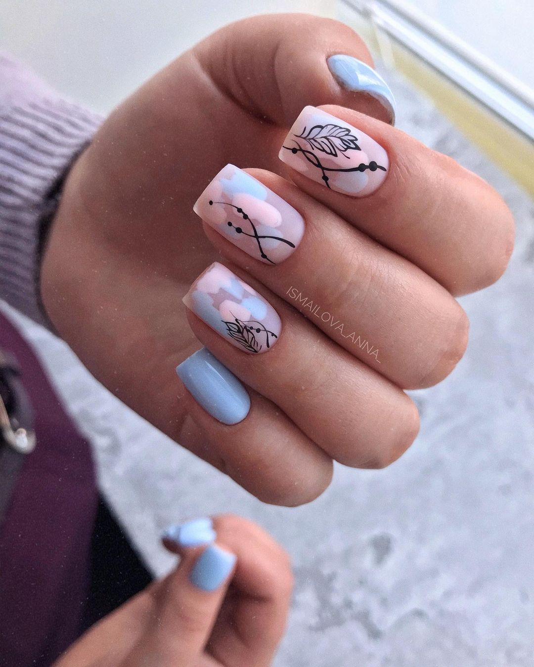 Рисунки. Пастельные оттенки прекрасно сочетаются с рисунками черного цвета. Причем нет большой разницы, что именно нарисовано на ногте: звери и птицы, древние руны и обычные надписи.
