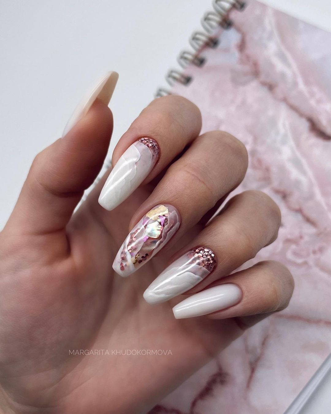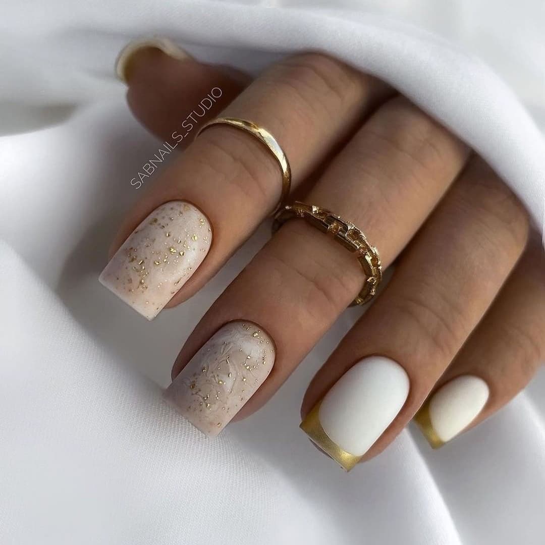 Для создания модных образов этого сезона мастера используют перламутру, матирующие лаки и блестки. А мега-модными летом 2022 года считаются комбинации нюдовых цветов с яркими деталями. Это может быть бежевый френч с желтой «улыбкой», розовый фон с золотым декором и, конечно, белая основа с геометрическим, абстрактным или графити-рисунком.