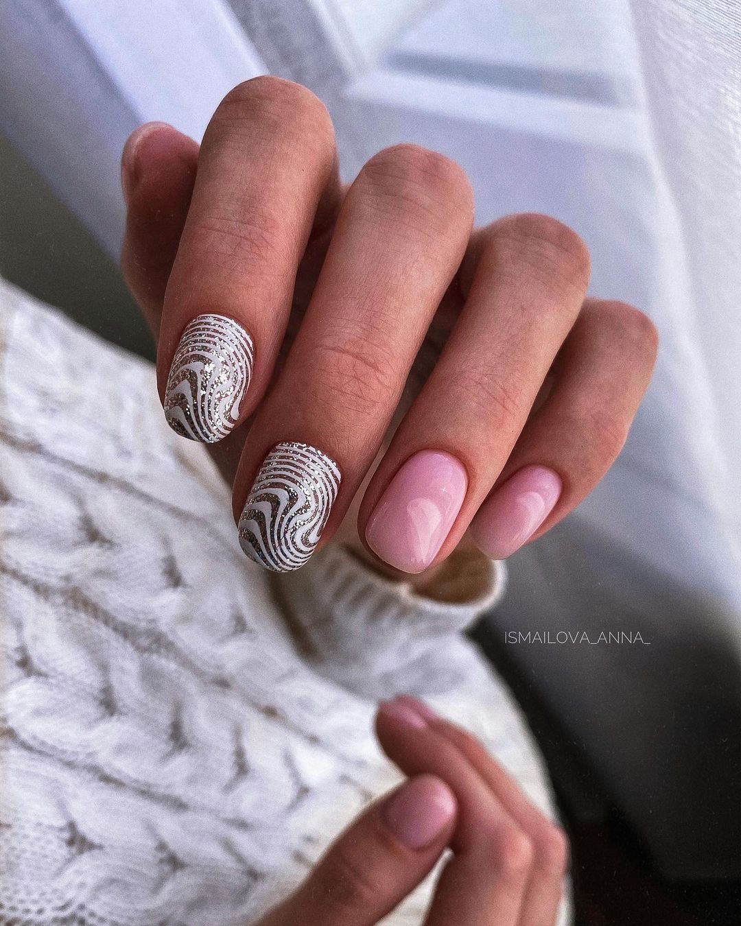 Любой маникюр в пастельных тонах с рисунком способен украсить ухоженные ручки. В рисунке часто используют тот же цвет, из которого выполнен основной маникюр. Вырисовывать необычные художества можно как на всех ноготках, так и на одном-двух.