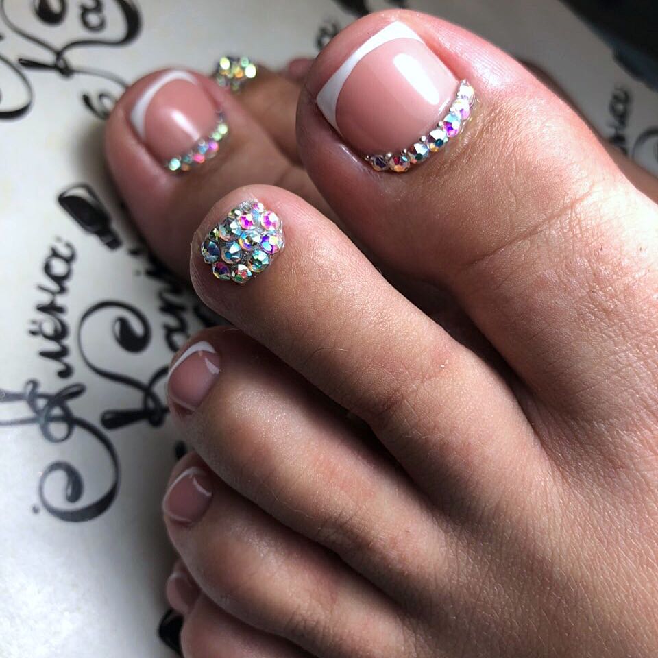 Это идеальный вариант для тандема с красивыми туфлями и нежным платьем. Также актуальны стразы, но их не стоит добавлять в большом количестве. Нейл-мастера рекомендуют располагать декор на большом пальце ноги — интересно будет смотреться какой-то незамысловатый узор, выложенный из маленьких стразиков.