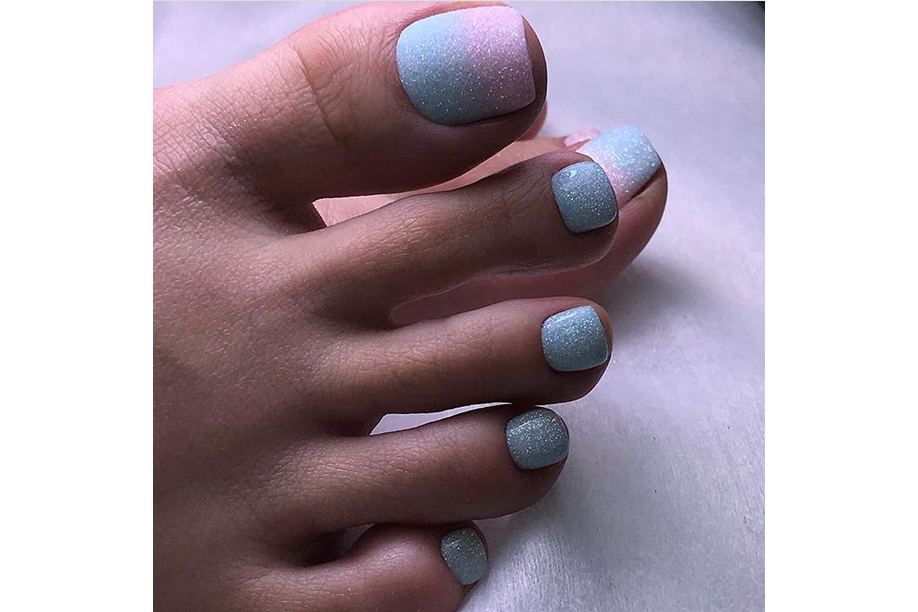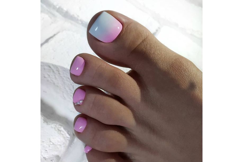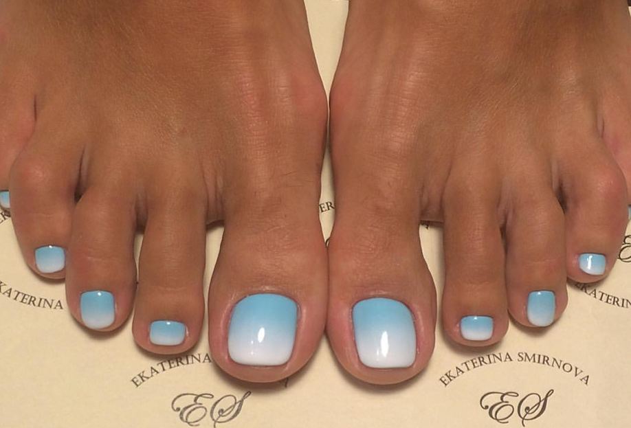 Отличием педикюра омбре является плавный переход цветов. В результате удается достичь красивой растяжки цвета.