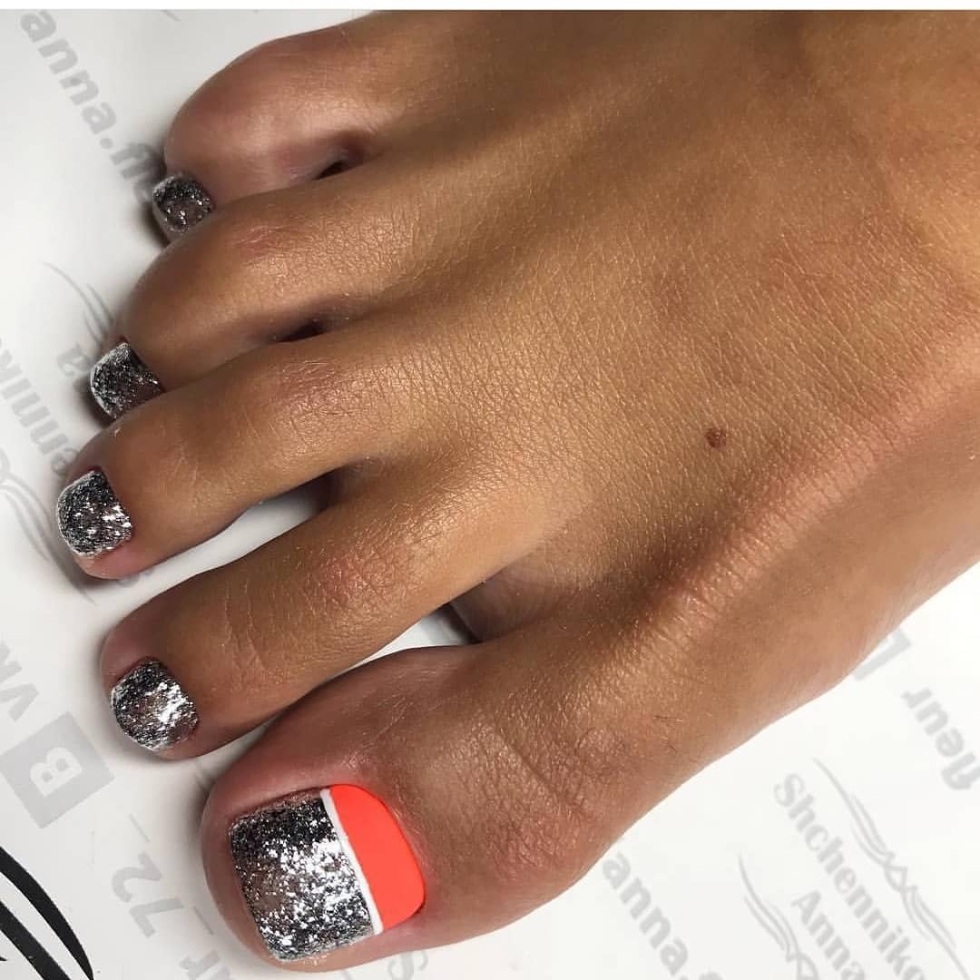 Серебристый, золотой и голографический глиттер может стать красивым дополнением светлого педикюра. В отличие от педикюра со стразами, глиттер не добавляет дизайну объема, а значит он более практичен и удобен в носке. С помощью глиттера можно создать плавный переход цвета на ногтевой пластине или покрыть им выборочно 1 – 2 ноготка.