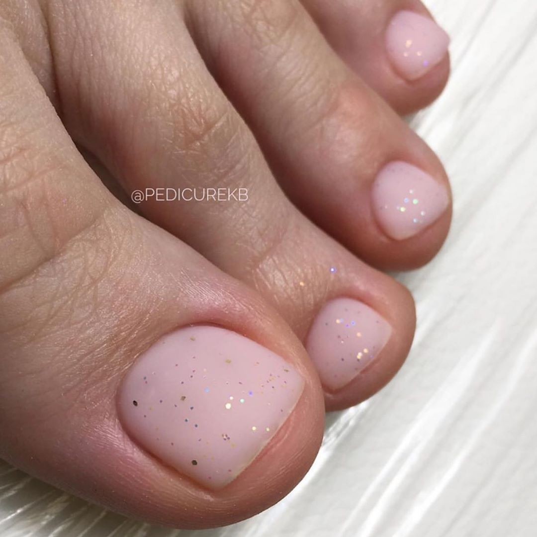 Если вы хотите создать более яркий и праздничный дизайн, стоит обратить внимание на блестки. С ними ваш нюдовый педикюр приобретет очень стильный вид. Это идеальный вариант для тандема с красивыми туфлями и нежным платьем
