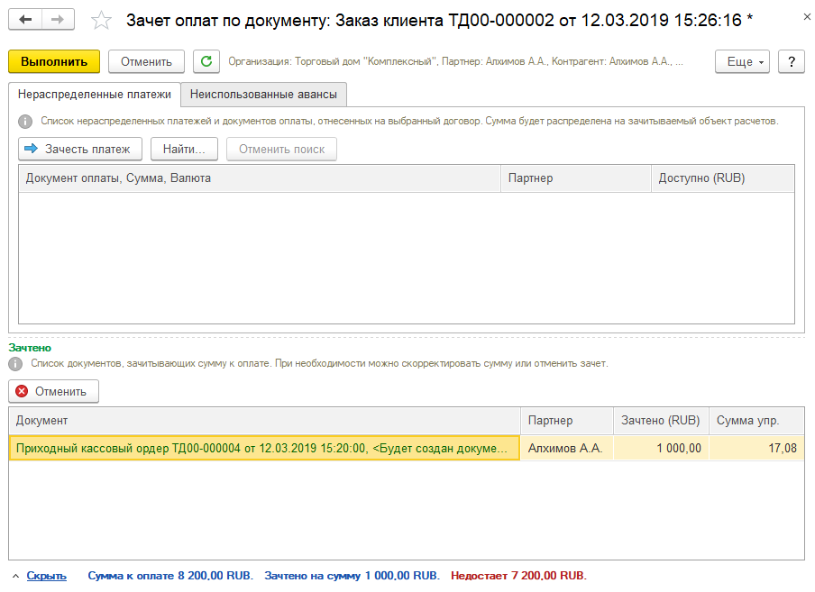 Выполним зачет ранее принятого аванса по кнопке «Зачет оплаты»: