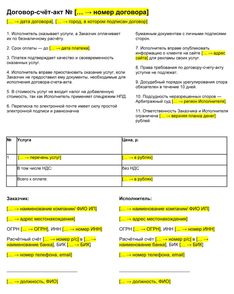 Все зависит от того, как протекает сотрудничество. Если клиент работает с фрилансером (самозанятым или индивидуальным предпринимателем), он может использовать договор-счет-акт. Это упрощенная форма документа, заменяющая собой сразу три бумаги.