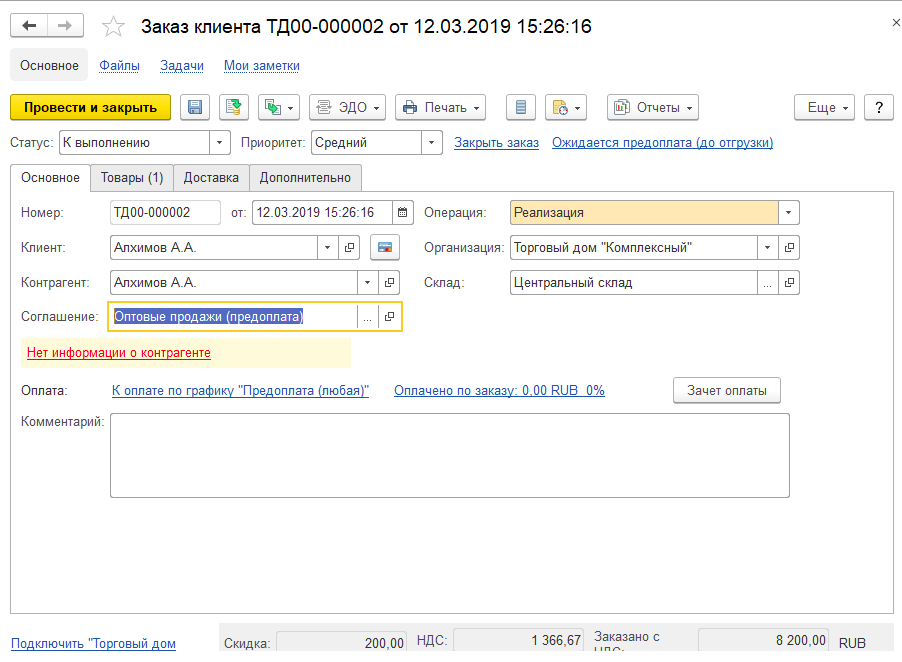 Создадим заказ клиента, в качестве покупателя укажем контрагента, от которого получали аванс: