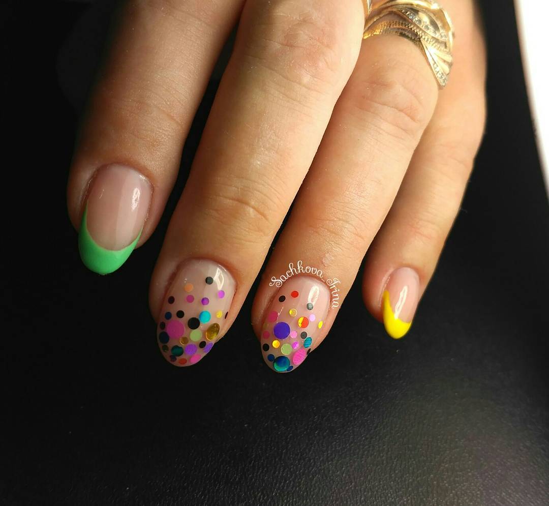 Хотите быть яркой не только за столом, но и на танцполе, когда свет приглушен — оформите лунку или улыбку с помощью светоотражающего гель-лака. Сделать небольшой акцент в маникюре можно с помощью самого активного оттенка — от просто яркого до кислотного.