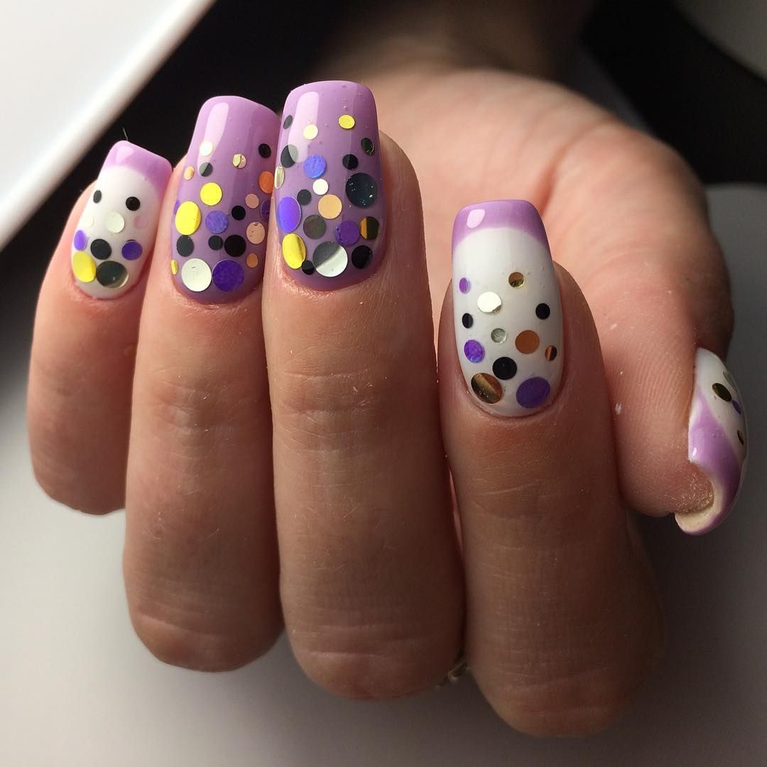 Крупные разноцветные блестки в сочетании с мелкими стразами станут дополнением новогоднего дизайна. С ними можно сочетать маникюр, выполненный с помощью любой техники: омбре, стемпинга, гелевой паутинки и других.