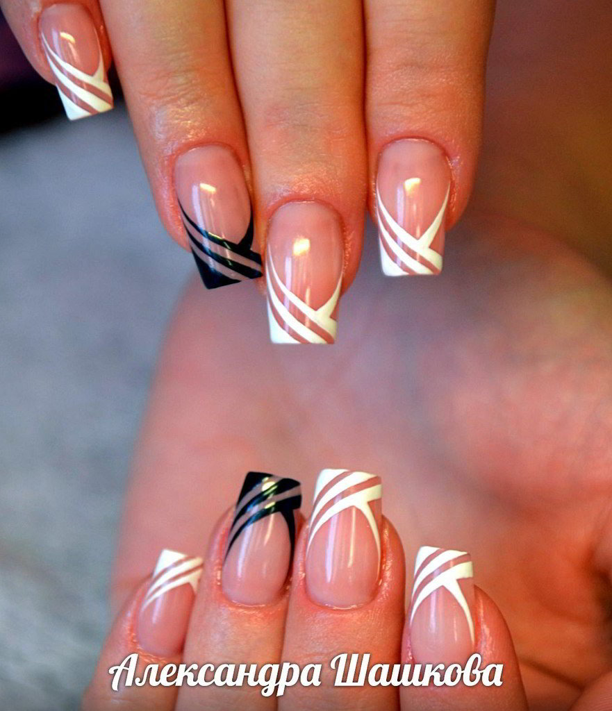 Возможно, вы захотите сделать себе очень нежный и воздушный маникюр. Просто украсьте классический френч легкой паутинкой или сеткой. Воздушная черно-белая композиция добавит образу немного таинственности. Если у вас квадратные ногти, попробуйте поэкспериментировать с различными линиями. Полоски могут быть прямыми или волнистыми, вертикальными или горизонтальными. Черно-белый принт, повторяющий дизайн ногтей в стиле зебры, не останется незамеченным. Насладитесь просмотром интересных идей на фото, каждая из которых может быть реализована вами.