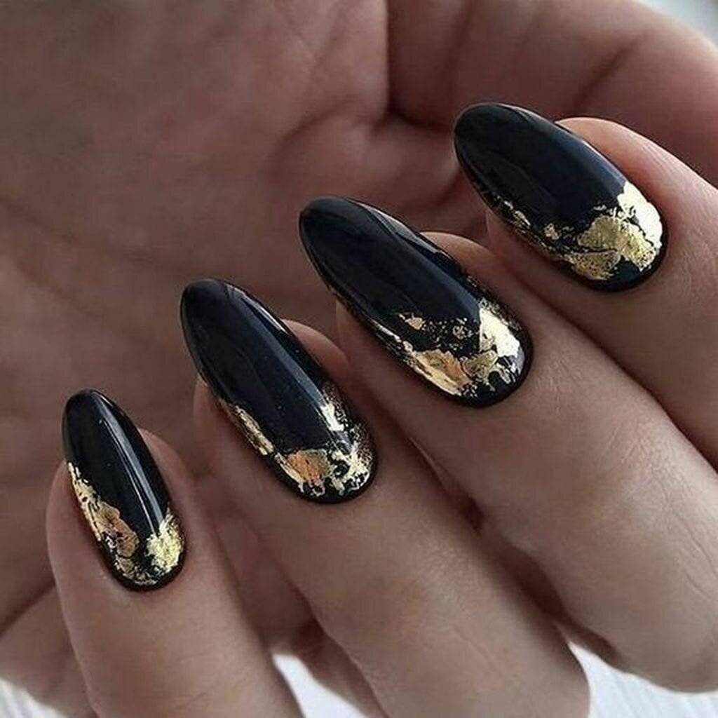 Такой дизайн ногтей будет выглядеть богемно. Дополнят образ золотые украшения на шее, а также небольшой клатч с золотистой цепочкой. С таким нейл решением красиво, изысканно будет смотреться черное платье в пол. Дизайн ногтей с золотым блеском подойдет как для загорелых, так и для белоснежных девушек.