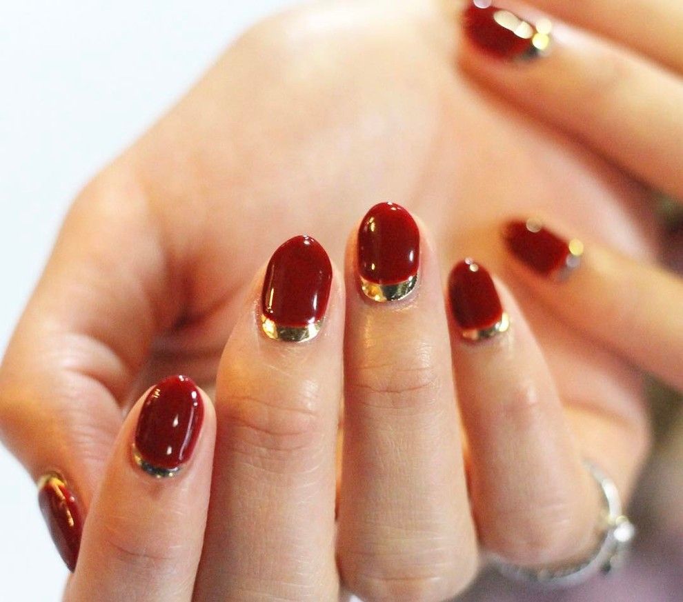 Самый простой, но невероятно модный альянс: красная ногтевая пластина, увенчанная золотистой «линией улыбки».