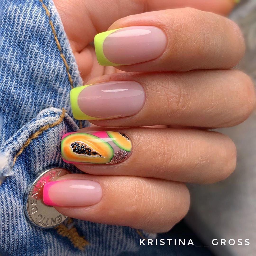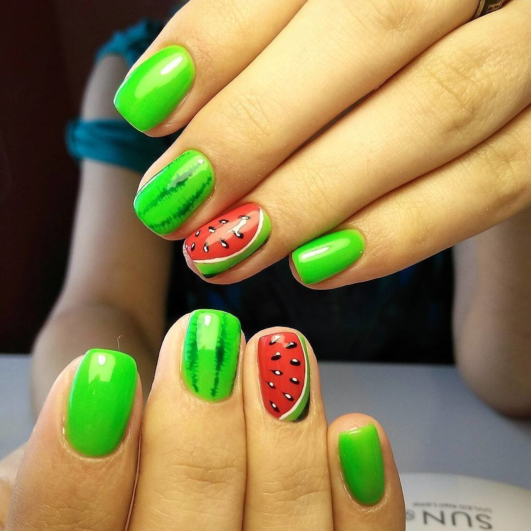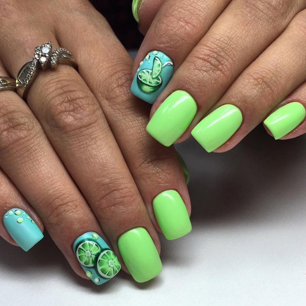 Для летнего зеленого маникюра больше всего подойдет оттенок молодой травы и нежный приглушенный ментоловый. Такой маникюр просто немыслим без рисунков фруктов: