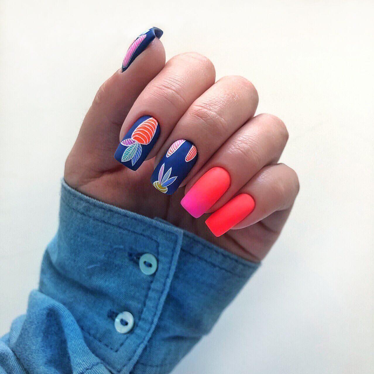 Такое сочетание цветов в маникюре встречается не часто, однако результат подобного дуэта весьма впечатляет. Именно поэтому дизайнеры в этом году советуют модницам, поближе присмотреться к интересным идеям оформления ноготков в такой тональности, ведь тандем синего и зелёного в 2020 году признан «писком» моды. Одним из суперстильных вариантов, который смотрится очень ярко и необычно, считается сочетание тёмного синего покрытия и неоново-зелёных рисунков. Не менее впечатляет градиентный переход зелёного и светло-синего. Если вы предпочитаете более неброский маникюр, отдайте предпочтение пастельным оттенкам.