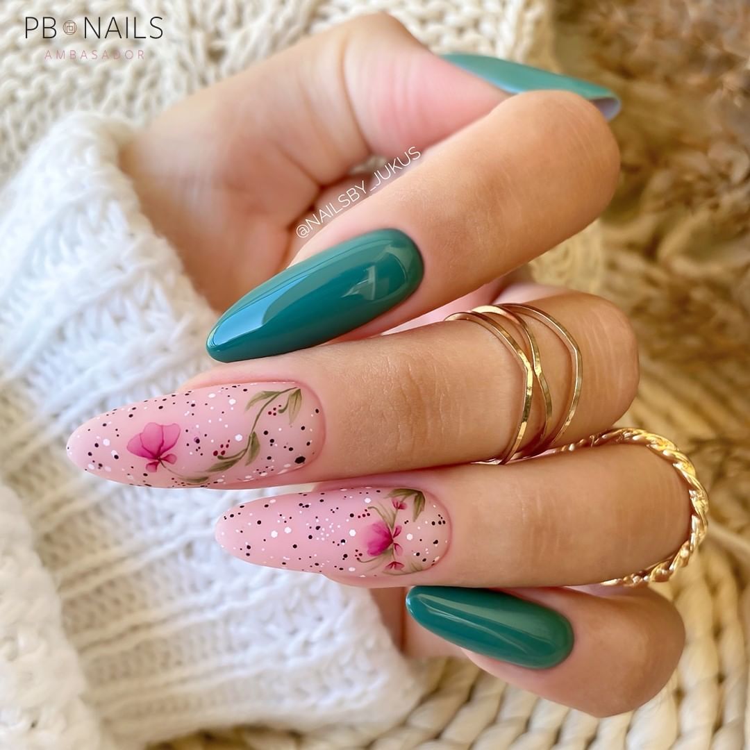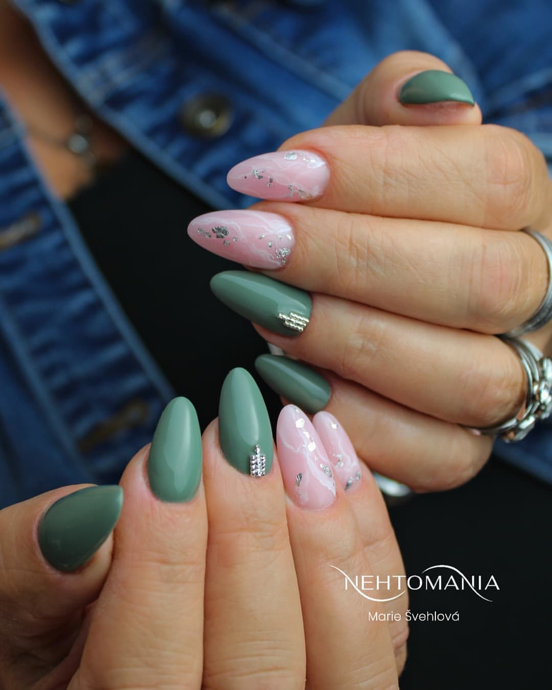 Весенние зеленые ноготки – это всегда что-то нежное и романтичнее. В сезон, предшествующий лету, впишется оливковый, салатовый и болотный цвета. Не обойтись и без флористических мотивов: