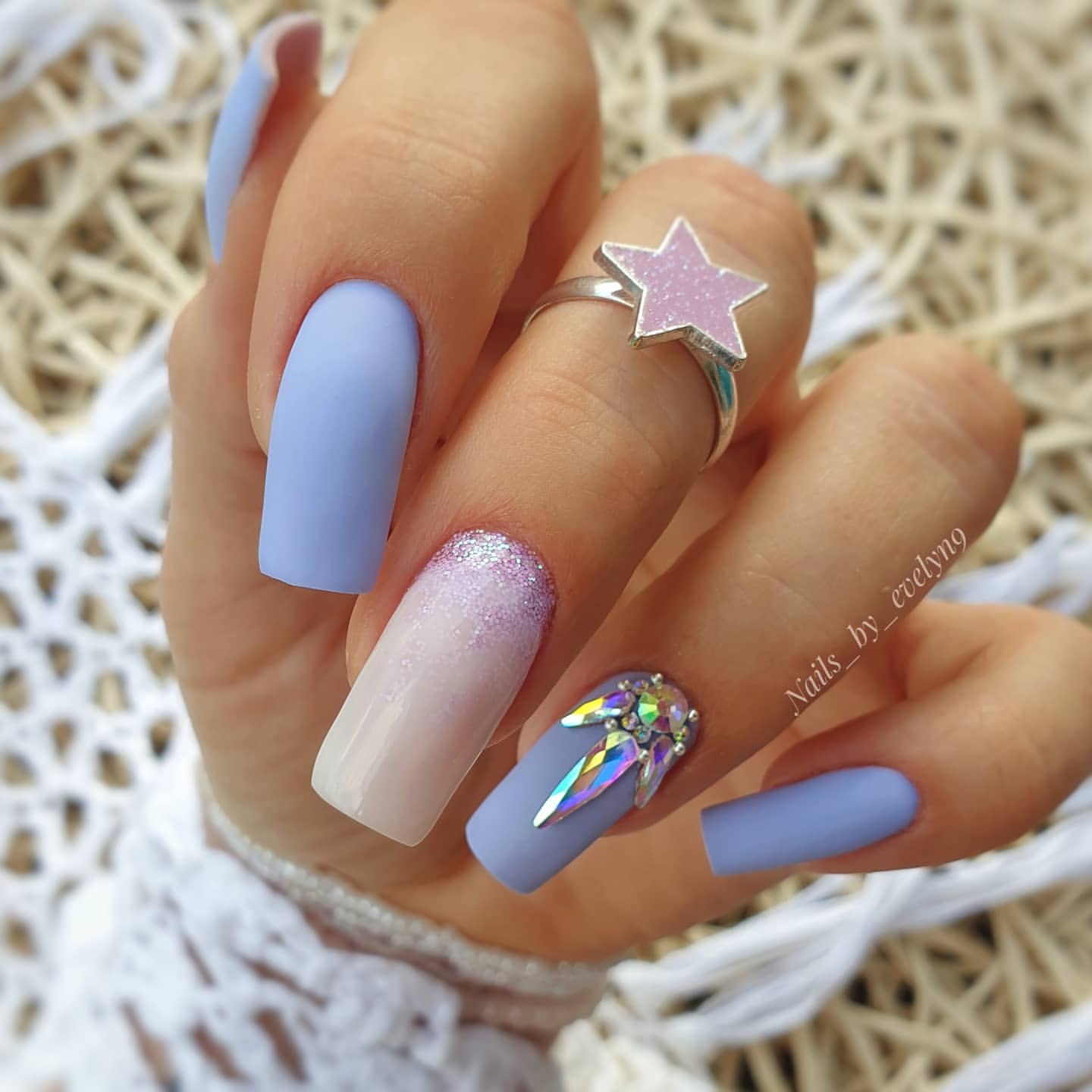 Сочетание синего и белого цвета сегодня считается наиболее распространённым вариантом дизайна. Это просто отличное решение, благодаря которому образ получится весьма интересным и нескучным. Синий оттенок может быть любым, от глубокого тёмного до нежного светлого. Благодаря белому цвету, любые сочетания будут смотреться стильно, свежо и эффектно. Сине-белый вид маникюра часто называют морским или используют этот дуэт для создания зимнего дизайна. Вы можете нанести белые рисунки на один из оттенков синего, или наоборот, украсить синими изображениями белые ноготки. Также очень красиво смотрится в таком маникюре выделение одним из цветов акцентного пальчика или комбинирование обоих покрытий на одном ноготке.