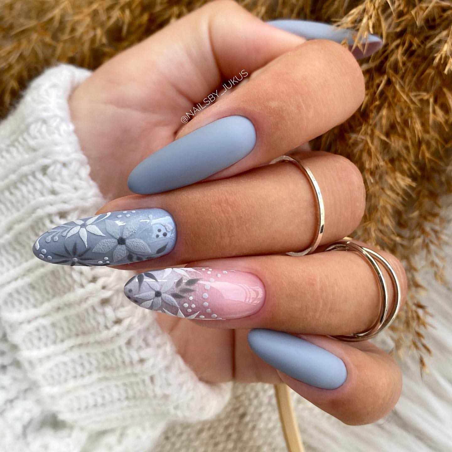 Синие или голубые ногти с нарисованными снежинками – классика новогоднего нейл-арта, которая из года в год не надоедает, несмотря на свою распространённость.