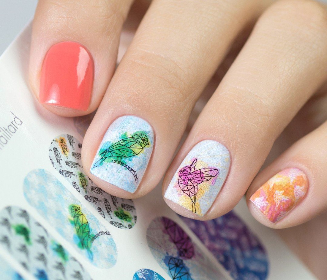 Также пользуются популярностью однотонные графические рисунки, изысканно подчёркивающие яркие покрытия, портретные рисунки, изображения сладостей, различных «женских» штучек и многие другие идеи. Рисунки наносятся на ноготки при помощи художественной росписи, стемпинга или специальных наклеек и могут красиво сочетаться с блестящими штрихами глиттера и другим декором.