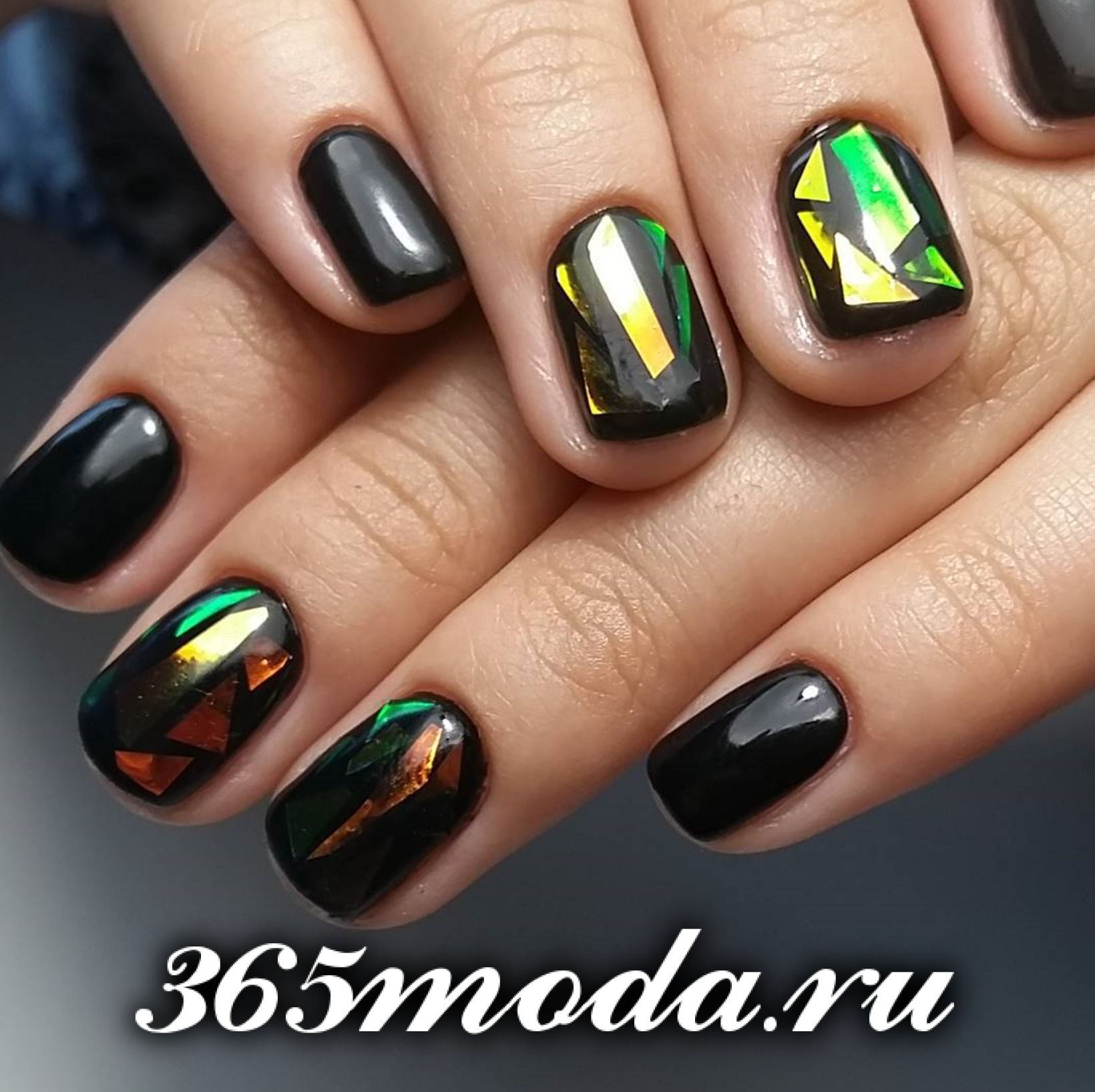 Для создания такого маникюра можно использовать слюду или специальную фольгу. Ее разрезают произвольными кусочками и, в зависимости от цвета лака, ваш маникюр всегда будет выглядеть по-разному. Можно создавать различные узоры, геометрические рисунки или просто делать россыпь.