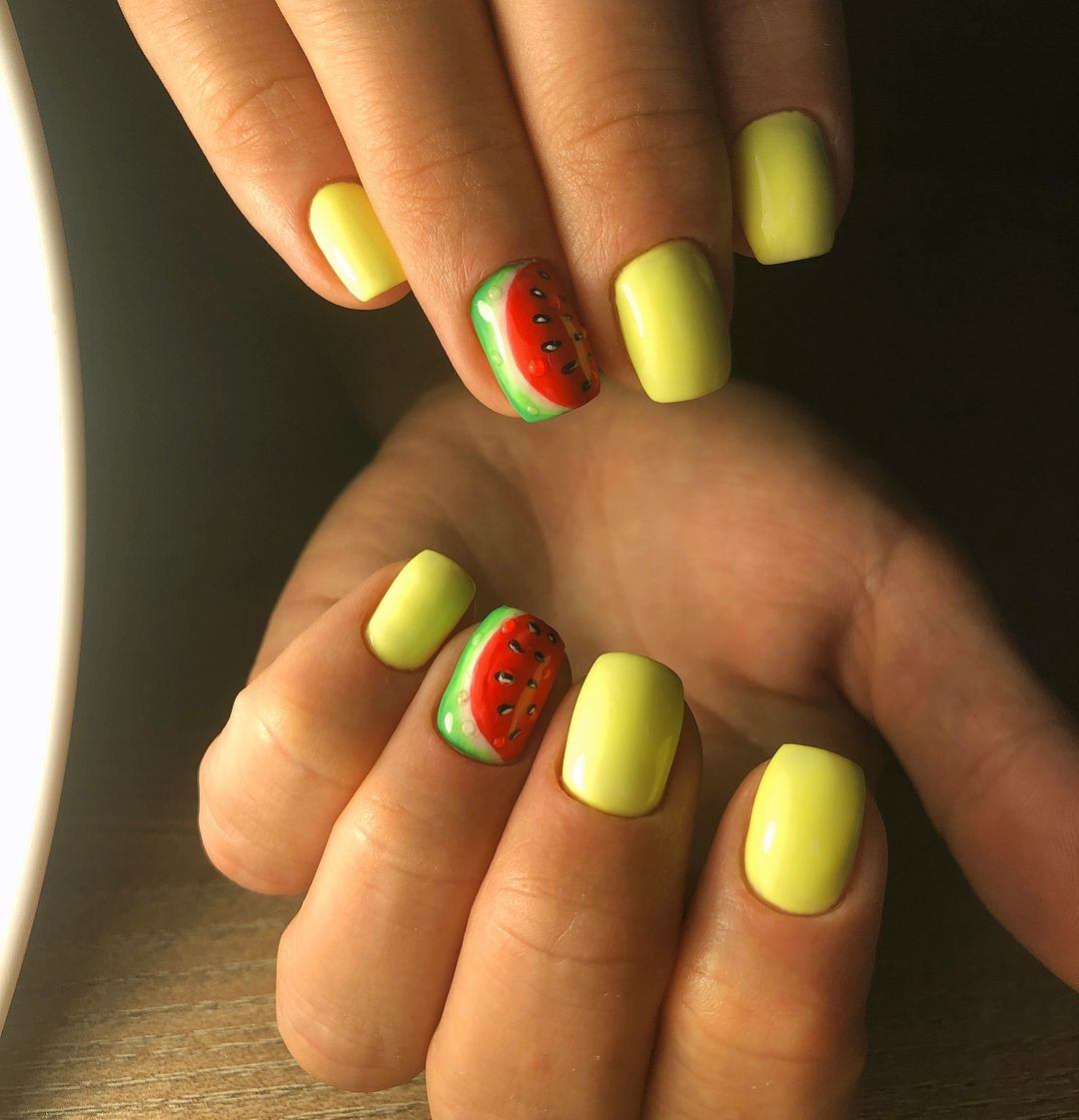 Четвертое место в нашем летнем nail-параде в этом году снова занимает всеми любимый дизайн с различными рисунками: фруктов и ягод, цветов и бабочек, моря и пальм, и других различных рисунков в летней тематике.