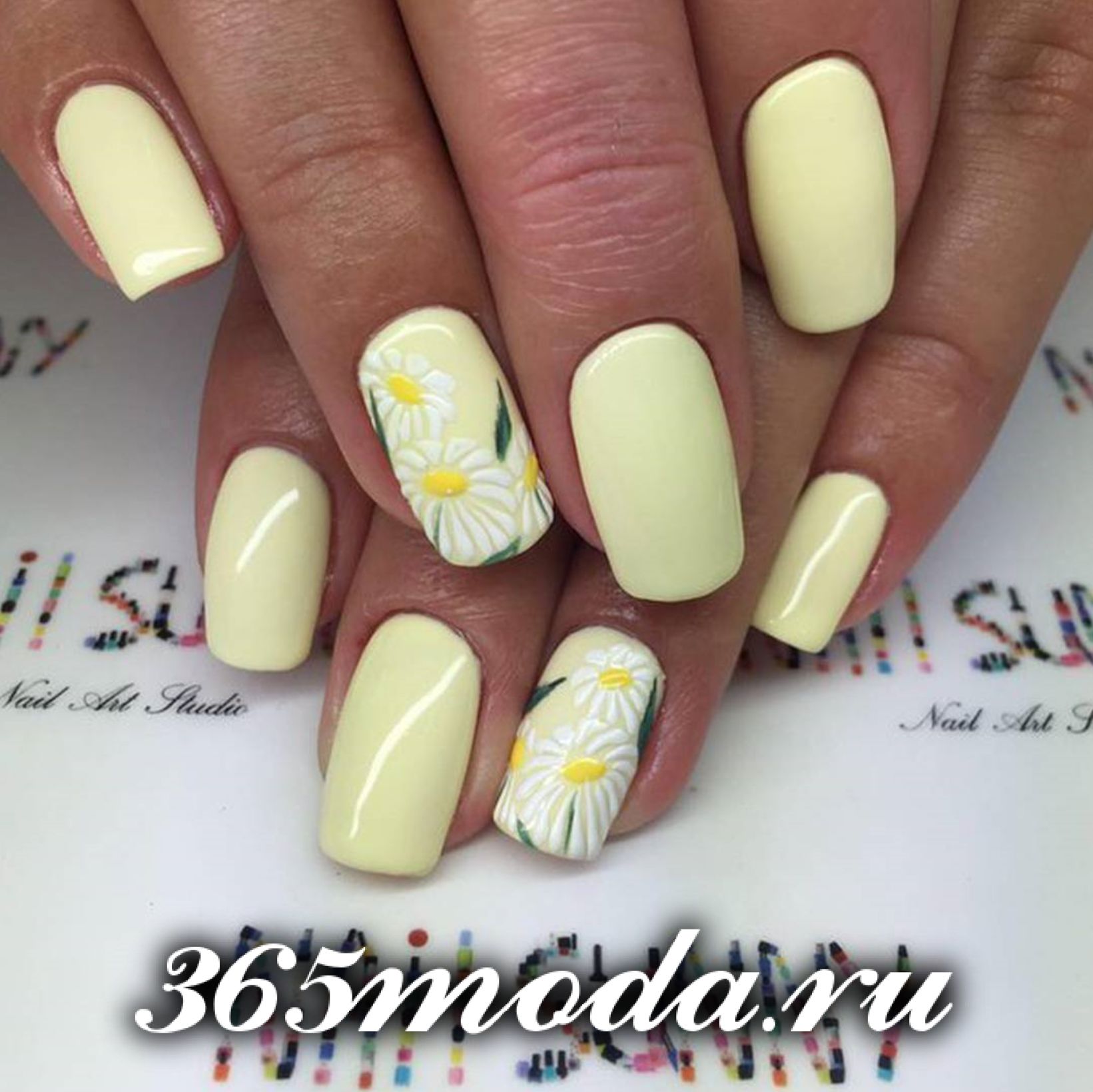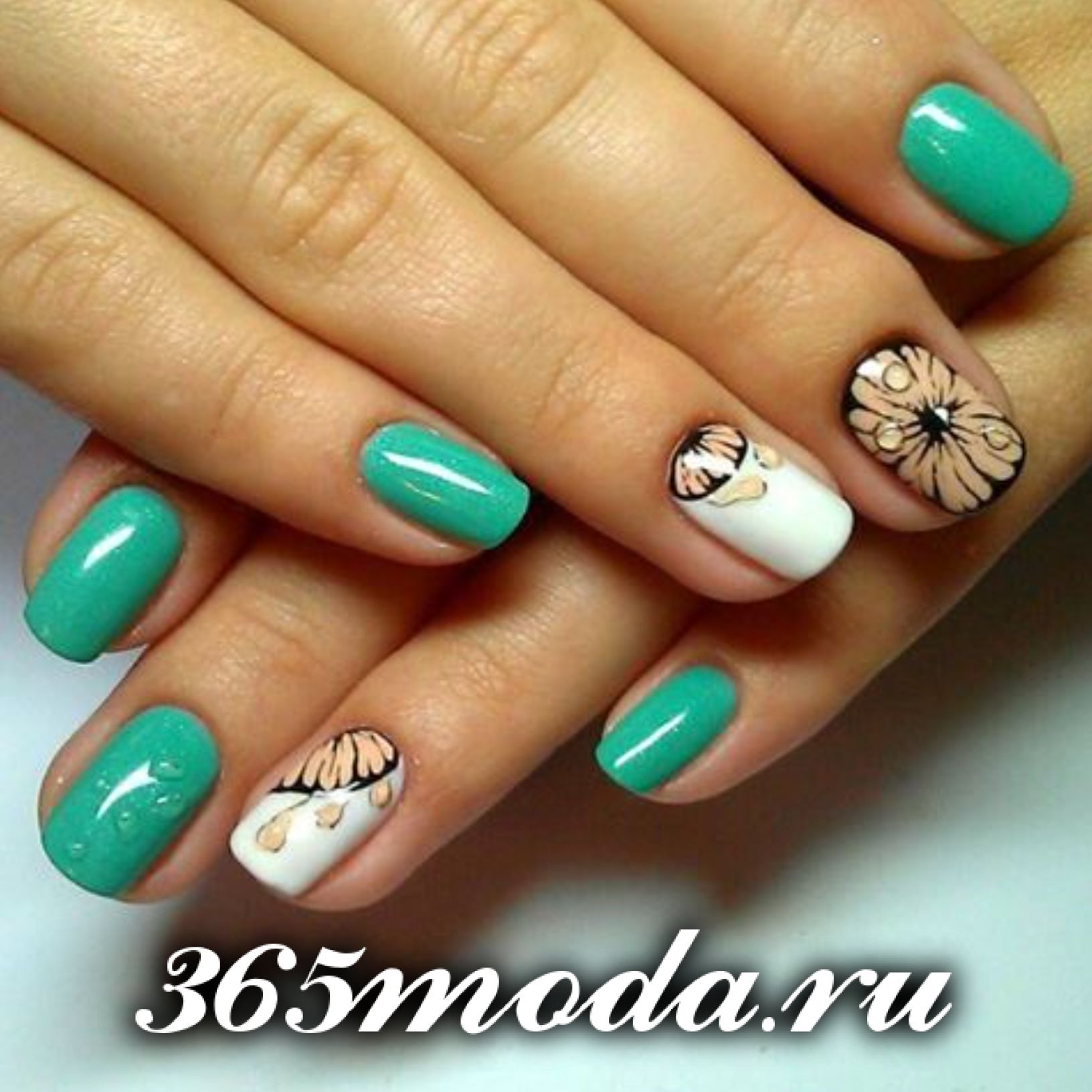 Номер три по-популярности — это рисунки различных летних цветов. Очень красиво и по-летнему нежно смотрятся рисунки: ромашек, пионов, маков, розочек, ноготков и различных других цветов, символизирующих лето. Причем, они очень красиво смотрятся как в ярком их исполнении, так и в нежных нюдовых тонах.