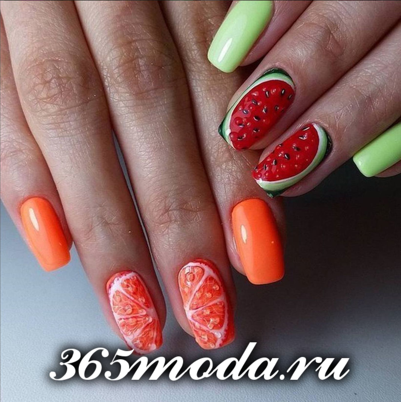 Номер один по-популярности — это рисунки летних сочных фруктов и ягод. Это — арбузы и папайя, клубника и вишня, лимоны и лаймы, авокадо и абрикосы, ананасы и кокосы, и много других соблазнительно вкусных и красивых фруктово-ягодных рисунков, от которых просто невозможно отвести взгляд. Эти рисунки прекрасно смотрятся как в глянцевом, так и в матовом их исполнении. А модные летние цвета, придают им особую сочность и привлекательность.
