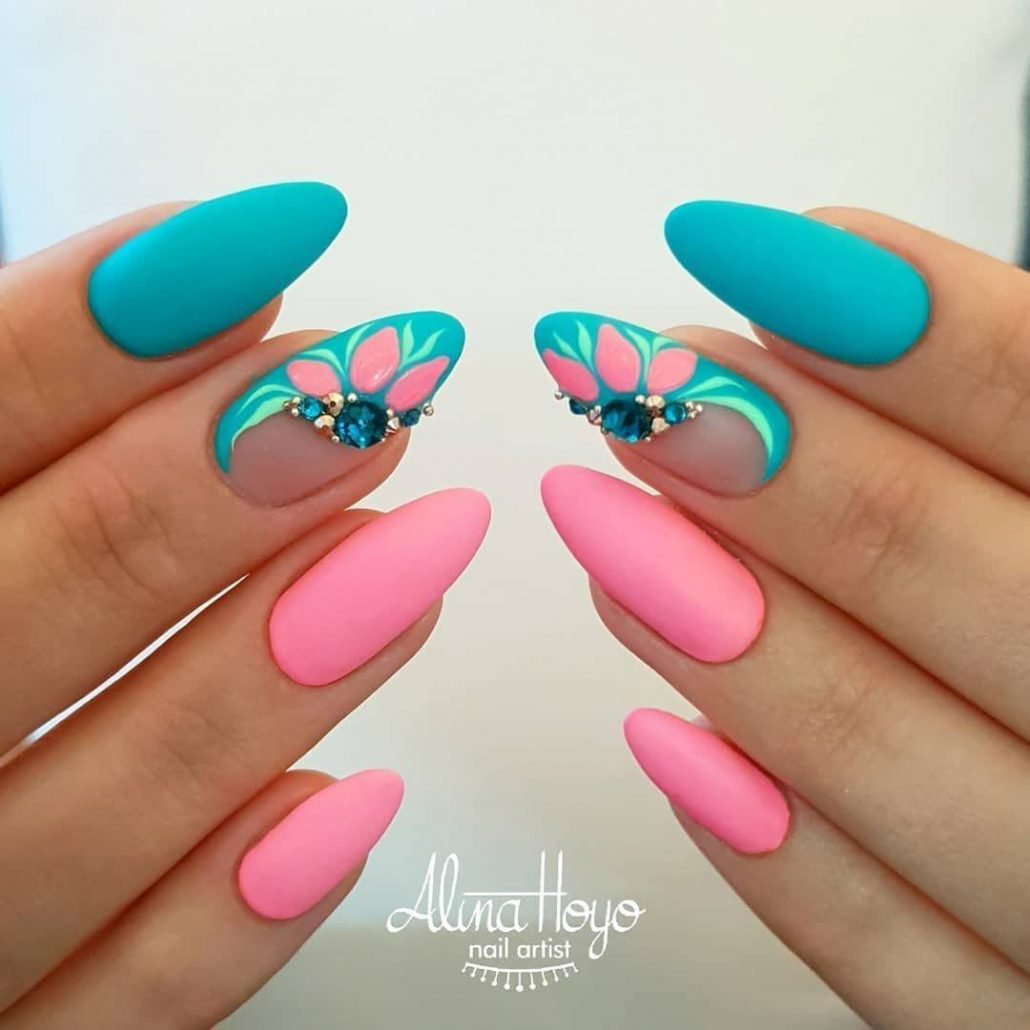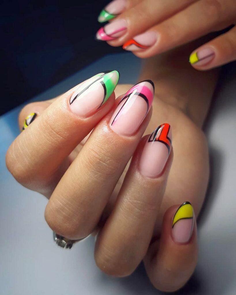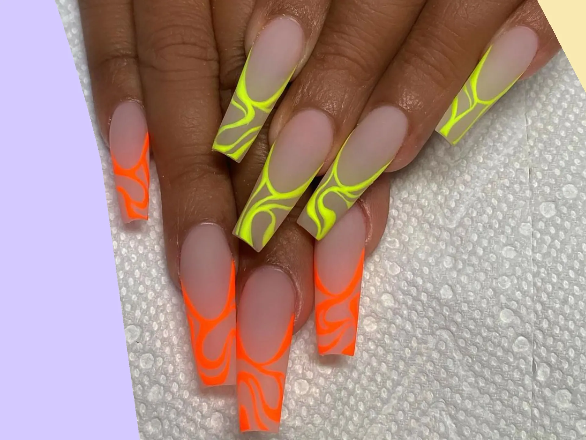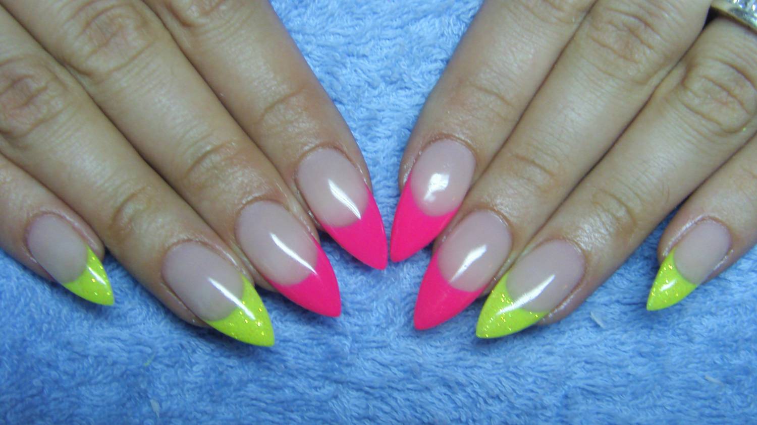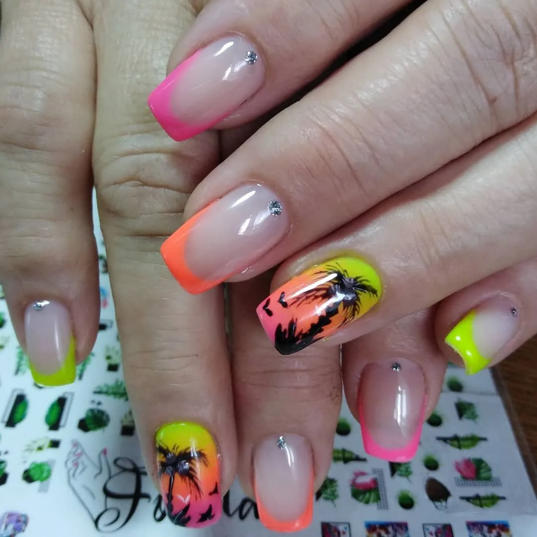 На таких ноготках идеально смотрится неоновый французский маникюр, а также нейл-арт с другими яркими оттенками. Тем не менее, нежная пастельная палитра тоже вполне допустима.