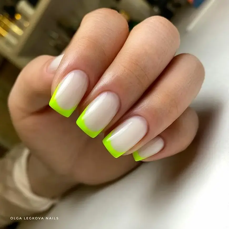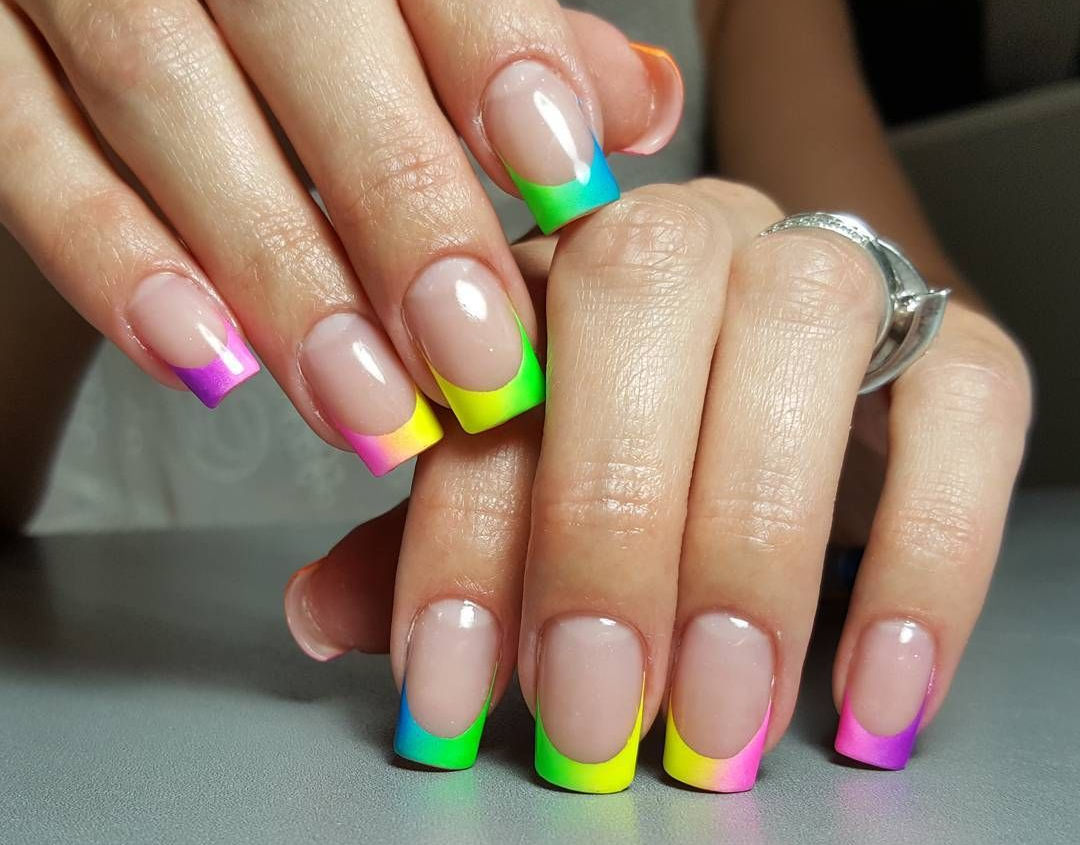 Сочный декор для ноготков эффектнее всего смотрится в тёплом сезоне, особенно, при выборе неоновых оттенков лака. Выбирайте цветной френч для разных фремён года.