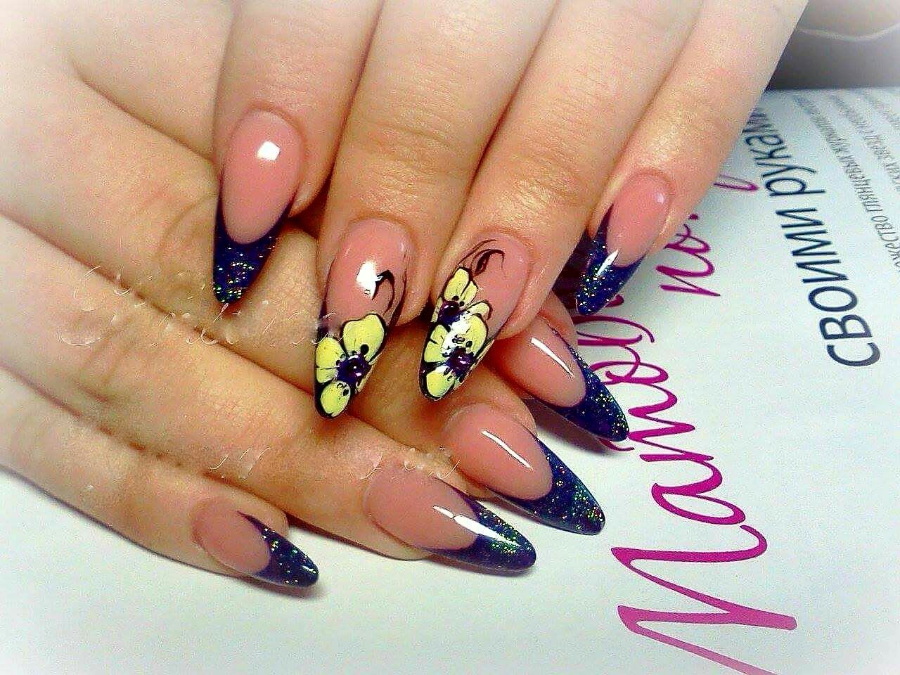 На миндальных ногтях красиво смотрятся треугольные, ассиметричные, ажурные лепестки. Овал зрительно делает пальцы более острыми, а американский вид дополняется блесками, наклейками.