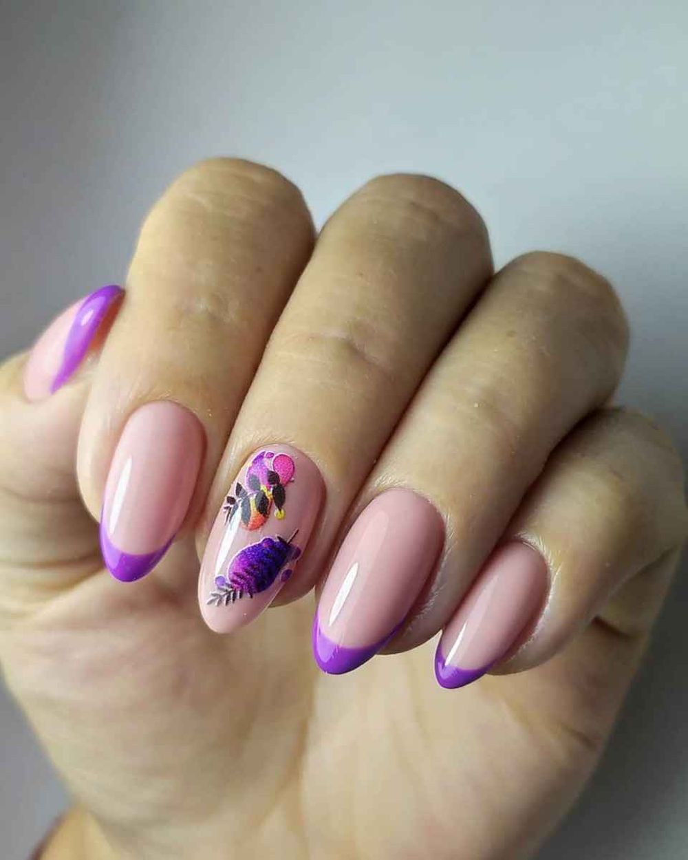 На ноготках-пуантах французский маникюр выглядит очень элегантно, сразу становится важной частью образа. Подходящие оттенки для кончика – зелёный, фиолетовый, коричневый, синий