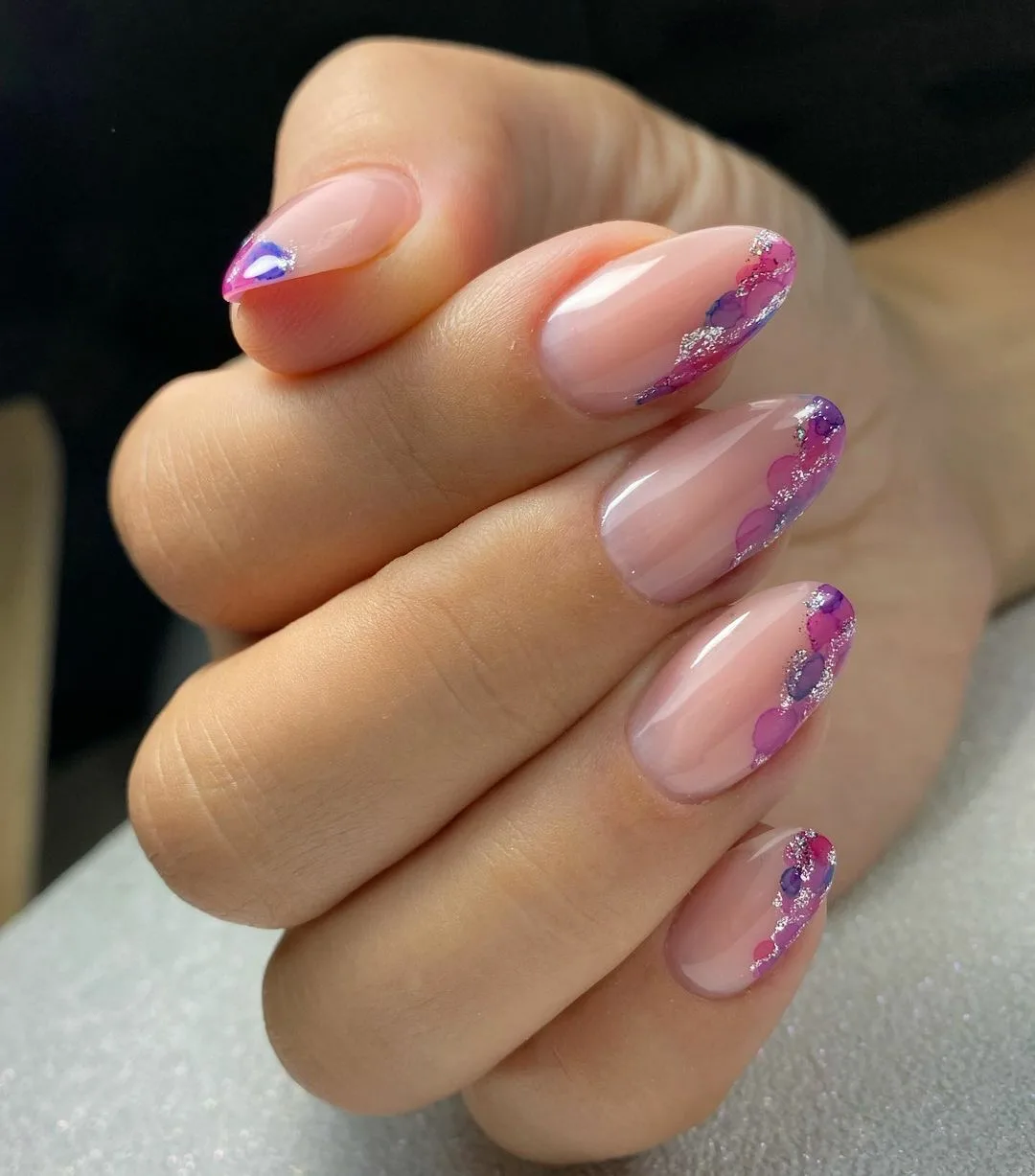 Эффект «улыбки» на кончике ноготка может быть очень размытым. Посмотрите, как свежо реализована тема блестящих мазков.