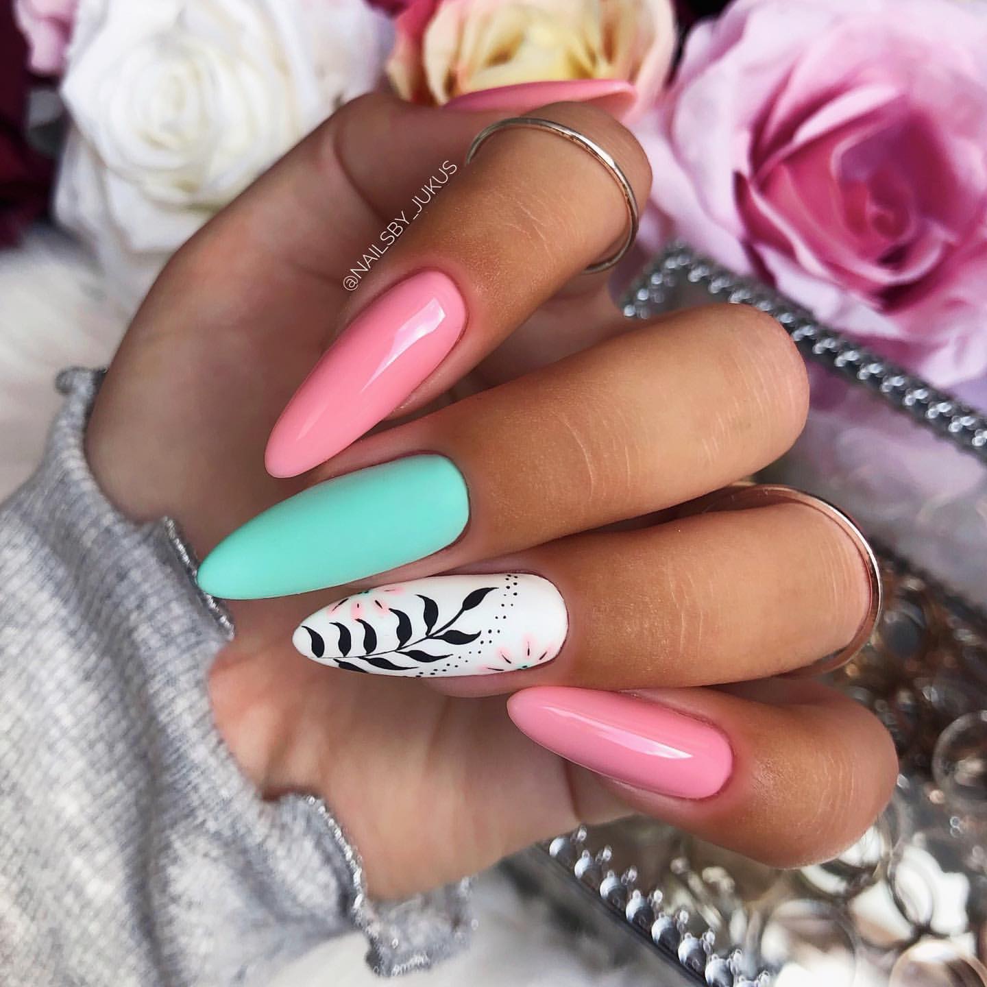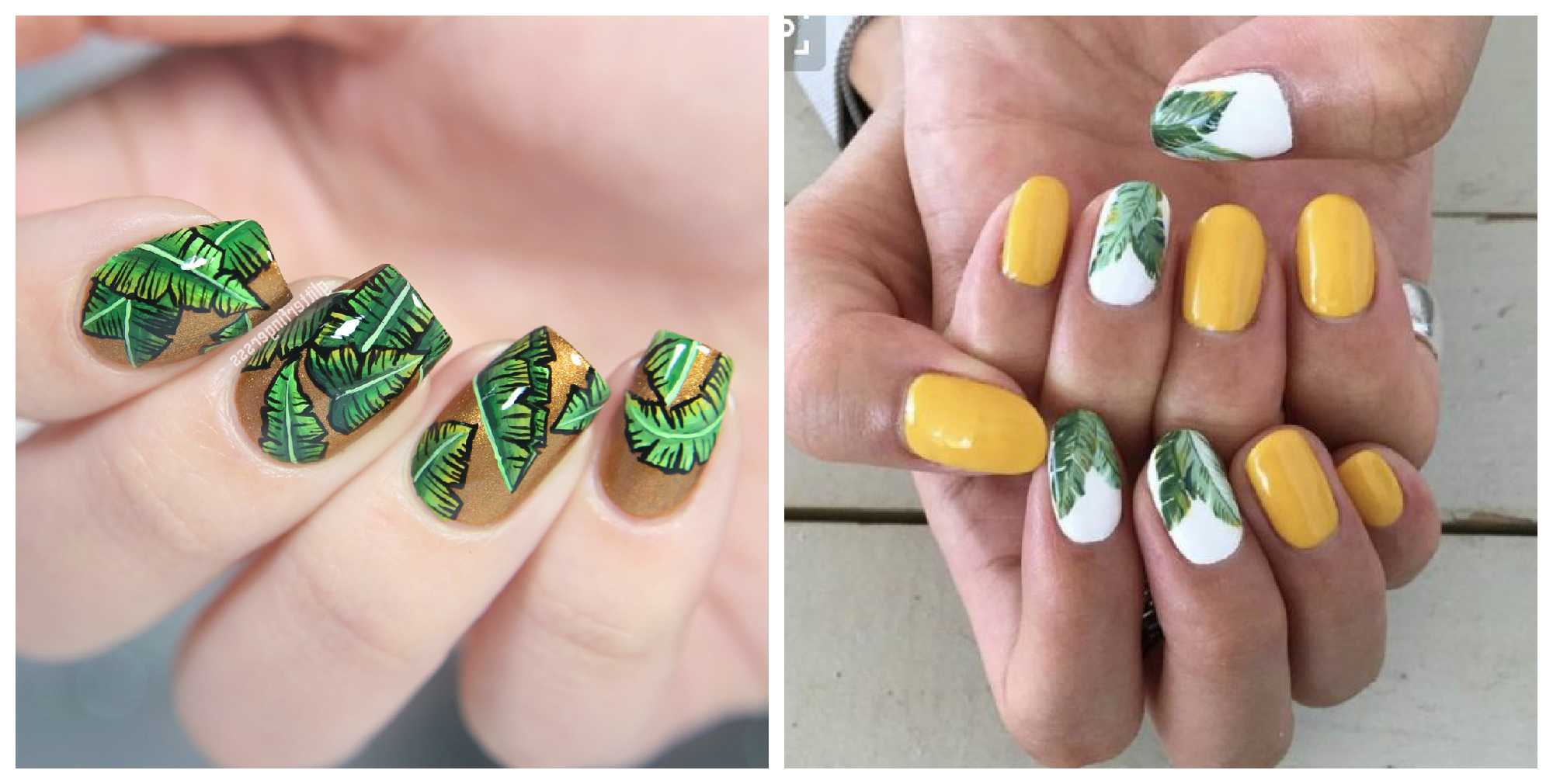 Очень эффектно изображения сочной зелени смотрятся на жизнерадостном желтом фоне. По мнению мастеров ногтевого сервиса, это одно из самых удачных цветовых сочетаний для летнего отдыха. Помимо этого, зеленый удачно миксуют с белым, черным и розовым колором.
