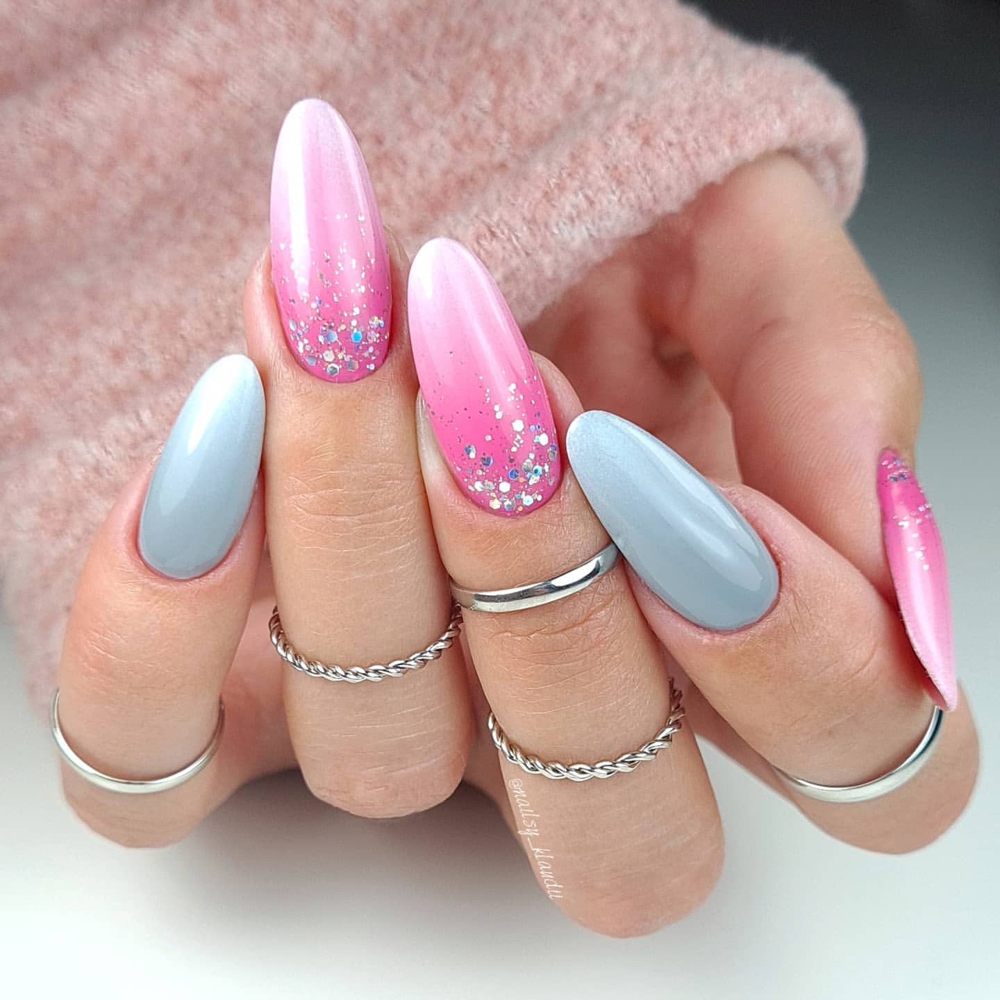 Кажется блестки уже никогда не выйдут из моды нейл арта. Несмотря на всю помпезность, этот вариант дизайна выбирает большое количество женщин. Чтобы снизить эффект новогодней елки, блестки сейчас используют в самом выгодном варианте. Можно покрыть несколько ногтей, а можно растянуть их от кутикулы к краю, создавая эффект градиента.